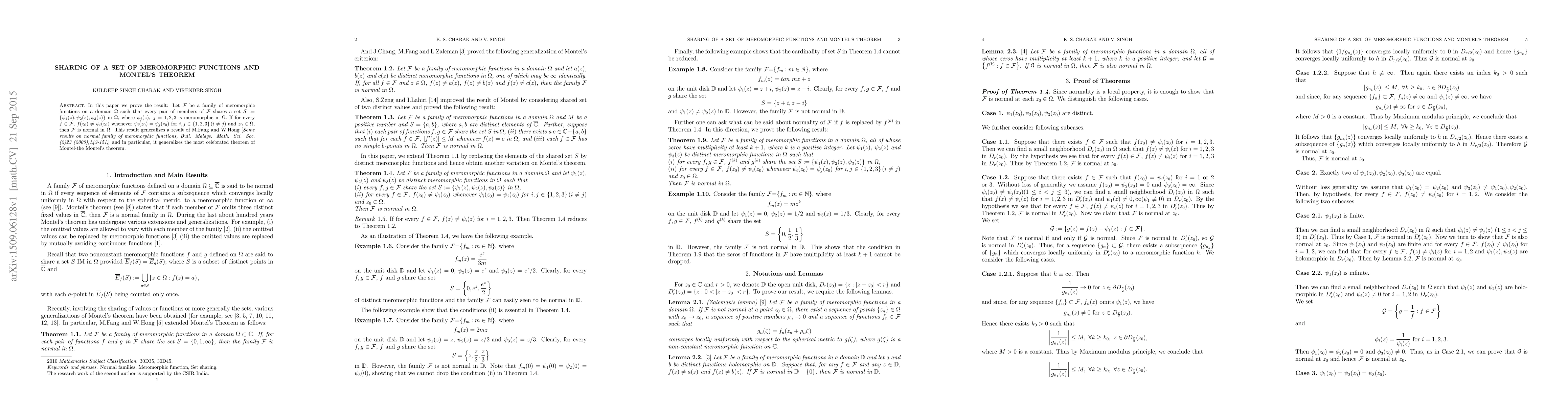 In this paper we prove the result: Let $\mathcal{F}$ be a family of meromorphic functions on a domain $\Omega$ such that every pair of members of $\mathcal{F}$ shares a set $S:=\left\{\psi_1(z), \psi_2(z), \psi_3(z) \right\}$ in $\Omega$, where $\psi_j(z), \ j=1,2,3$ is meromorphic in $\Omega.$ If for every $f\in \mathcal{F}$, $f(z_0)\neq \psi_i (z_0)$ whenever $\psi_i(z_0)=\psi_j(z_0)$ for $i,j\in \left\{1,2,3 \right\}(i\neq j)$ and $z_0\in \Omega ,$ then $\mathcal{F}$ is normal in $\Omega$. This result generalizes a result of M.Fang and W.Hong [Some results on normal family of meromorphic functions, Bull. Malays. Math. Sci. Soc. (2)23 (2000),143-151,] and in particular, it generalizes the most celebrated theorem of Montel-the Montel's theorem.