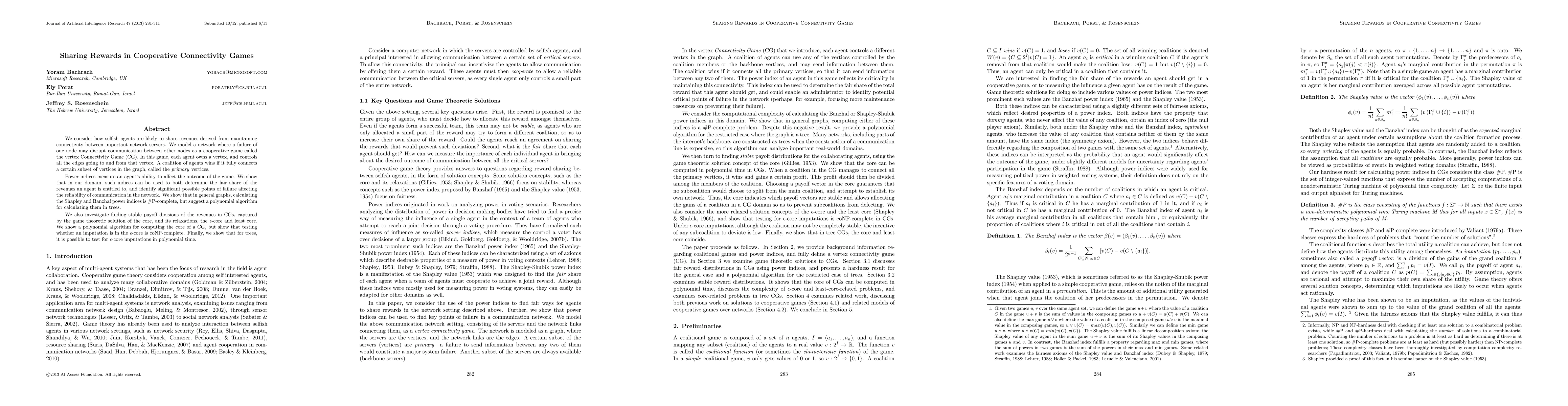 We consider how selfish agents are likely to share revenues derived from maintaining connectivity between important network servers. We model a network where a failure of one node may disrupt communication between other nodes as a cooperative game called the vertex Connectivity Game (CG). In this game, each agent owns a vertex, and controls all the edges going to and from that vertex. A coalition of agents wins if it fully connects a certain subset of vertices in the graph, called the primary vertices. Power indices measure an agents ability to affect the outcome of the game. We show that in our domain, such indices can be used to both determine the fair share of the revenues an agent is entitled to, and identify significant possible points of failure affecting the reliability of communication in the network. We show that in general graphs, calculating the Shapley and Banzhaf power indices is #P-complete, but suggest a polynomial algorithm for calculating them in trees. We also investigate finding stable payoff divisions of the revenues in CGs, captured by the game theoretic solution of the core, and its relaxations, the epsilon-core and least core. We show a polynomial algorithm for computing the core of a CG, but show that testing whether an imputation is in the epsilon-core is coNP-complete. Finally, we show that for trees, it is possible to test for epsilon-core imputations in polynomial time.