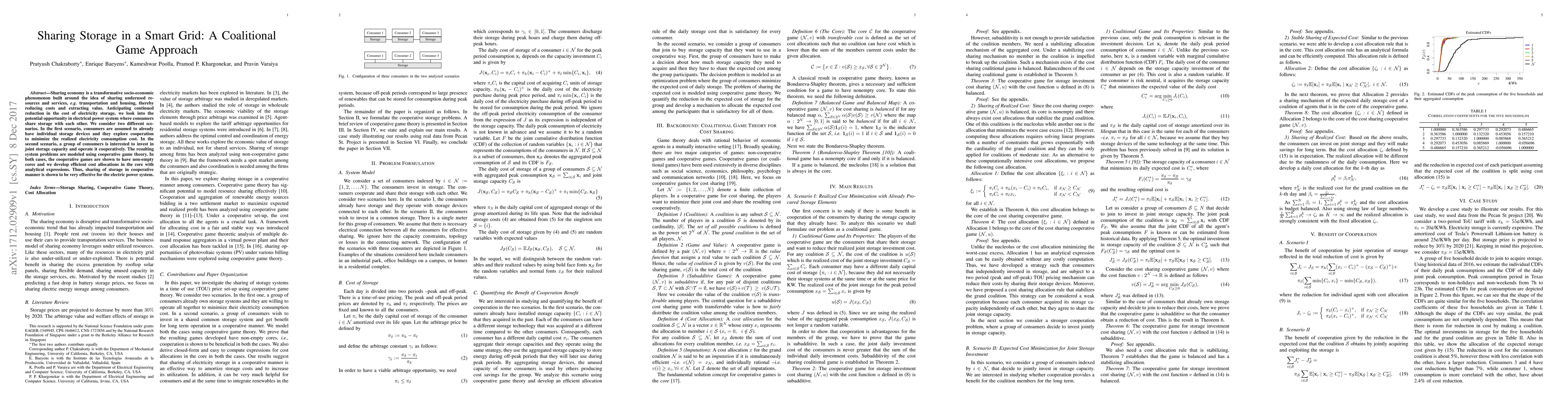 Sharing economy is a transformative socio-economic phenomenon built around the idea of sharing underused resources and services, e.g. transportation and housing, thereby reducing costs and extracting value. Anticipating continued reduction in the cost of electricity storage, we look into the potential opportunity in electrical power system where consumers share storage with each other. We consider two different scenarios. In the first scenario, consumers are assumed to already have individual storage devices and they explore cooperation to minimize the realized electricity consumption cost. In the second scenario, a group of consumers is interested to invest in joint storage capacity and operate it cooperatively. The resulting system problems are modeled using cooperative game theory. In both cases, the cooperative games are shown to have non-empty cores and we develop efficient cost allocations in the core with analytical expressions. Thus, sharing of storage in cooperative manner is shown to be very effective for the electric power system.
