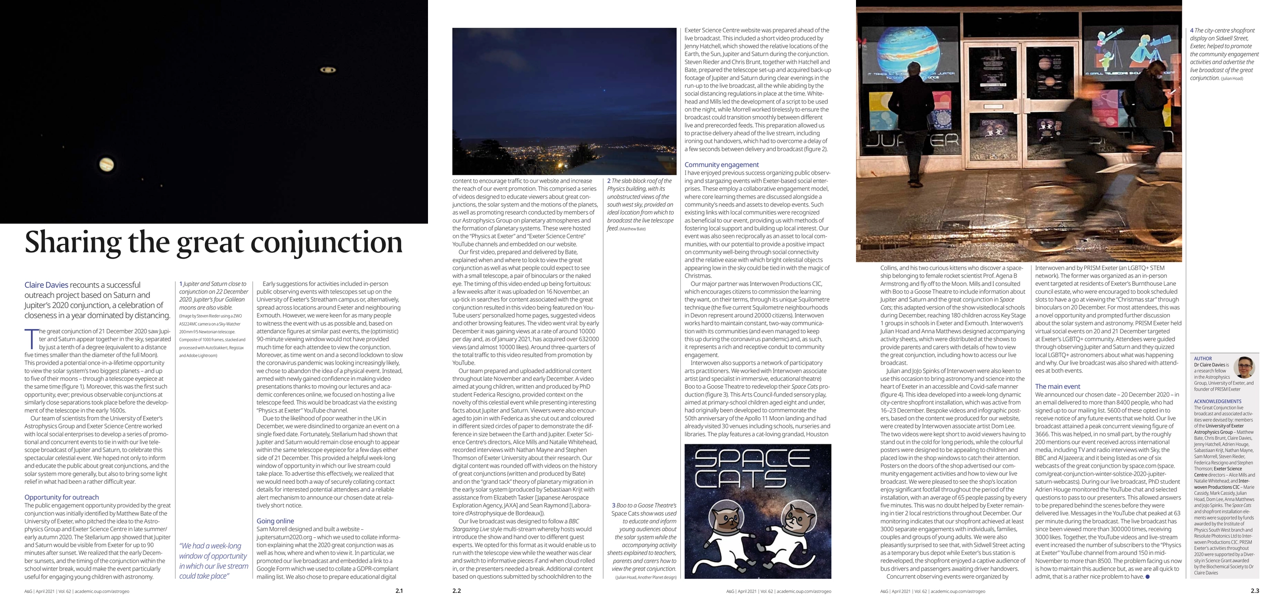 The paper details a unique opportunity on December 21, 2020, when Jupiter and Saturn appeared exceptionally close in the sky, visible through telescopes along with their moons. Researchers from the University of Exeter collaborated with local social enterprises to organize public events and a live telescope broadcast to educate and entertain, providing insight into solar system phenomena during a challenging year.