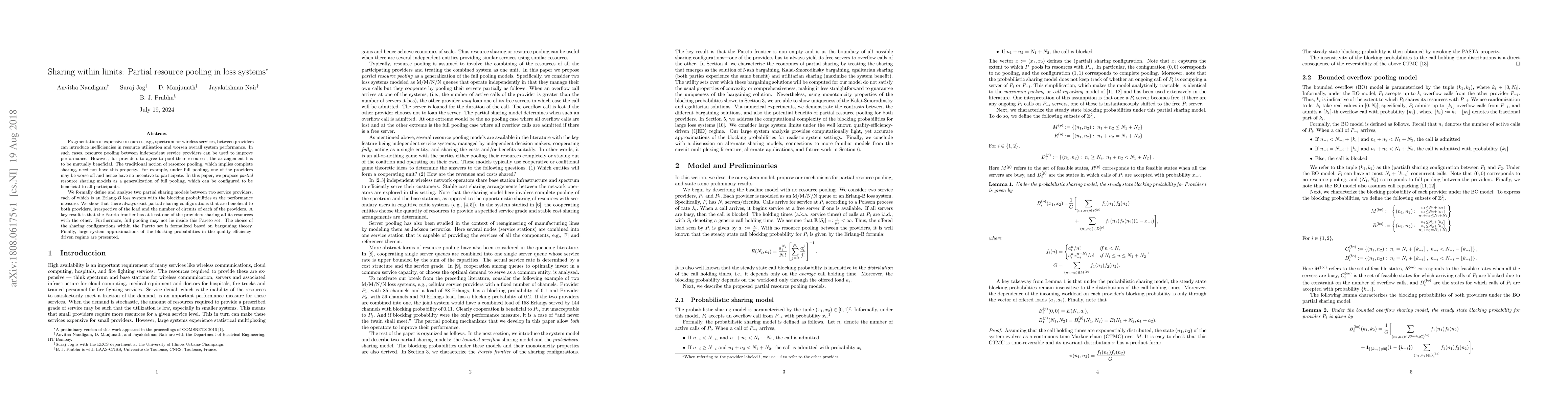 Fragmentation of expensive resources, e.g., spectrum for wireless services, between providers can introduce inefficiencies in resource utilisation and worsen overall system performance. In such cases, resource pooling between independent service providers can be used to improve performance. However, for providers to agree to pool their resources, the arrangement has to be mutually beneficial. The traditional notion of resource pooling, which implies complete sharing, need not have this property. For example, under full pooling, one of the providers may be worse off and hence have no incentive to participate. In this paper, we propose partial resource sharing models as a generalization of full pooling, which can be configured to be beneficial to all participants. We formally define and analyze two partial sharing models between two service providers, each of which is an Erlang-B loss system with the blocking probabilities as the performance measure. We show that there always exist partial sharing configurations that are beneficial to both providers, irrespective of the load and the number of circuits of each of the providers. A key result is that the Pareto frontier has at least one of the providers sharing all its resources with the other. Furthermore, full pooling may not lie inside this Pareto set. The choice of the sharing configurations within the Pareto set is formalized based on bargaining theory. Finally, large system approximations of the blocking probabilities in the quality-efficiency-driven regime are presented.