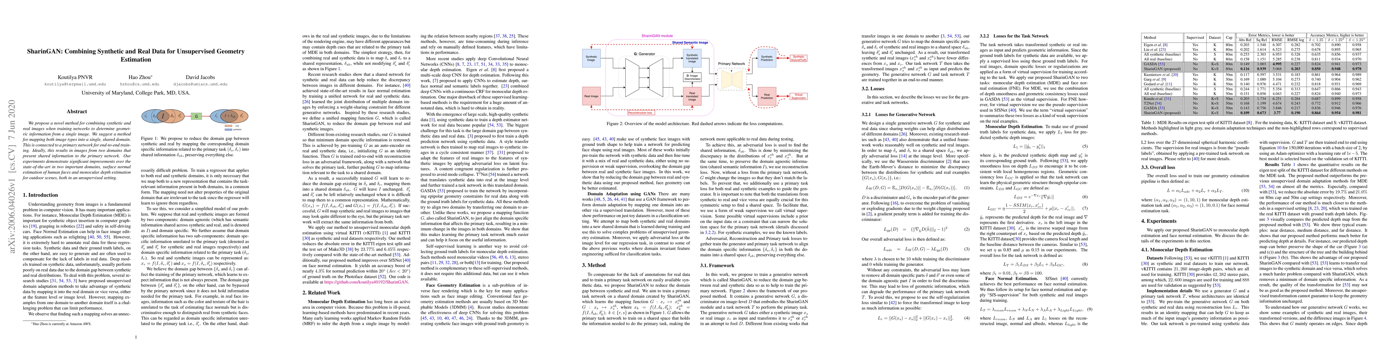 This paper introduces SharinGAN, a method merging synthetic and real images for unsupervised geometry estimation in networks. It maps both image types into a shared domain, connected to a primary network for end-to-end training. Results show significant improvements in surface normal estimation of human faces and monocular depth estimation for outdoor scenes compared to existing methods.