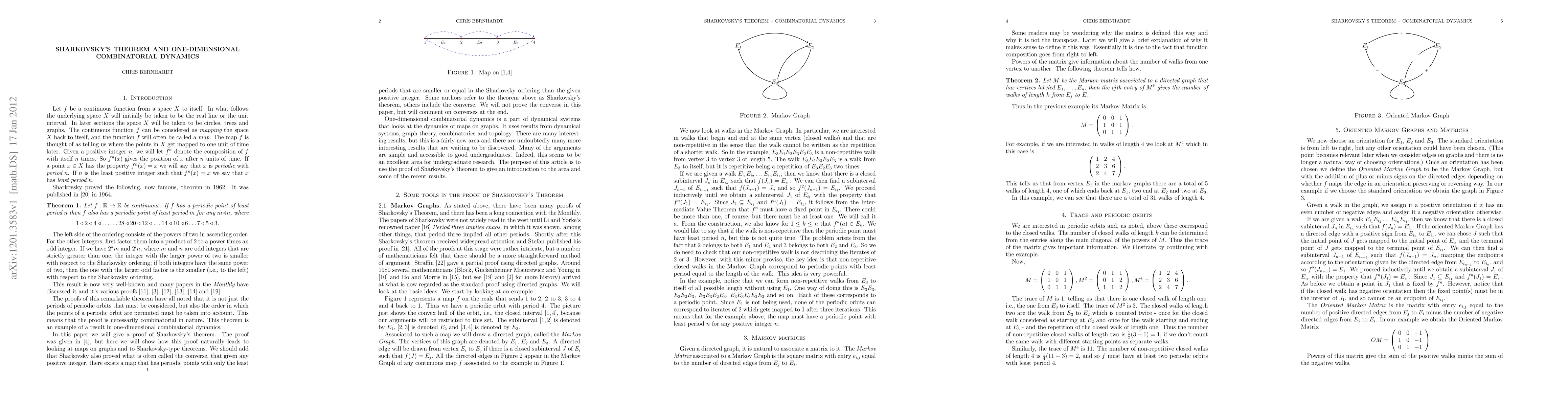 Sharkovsky's Theorem is proved, demonstrating its generalization to maps on graphs and related combinatorial dynamics. The paper serves as an accessible introduction to one-dimensional combinatorial dynamics.