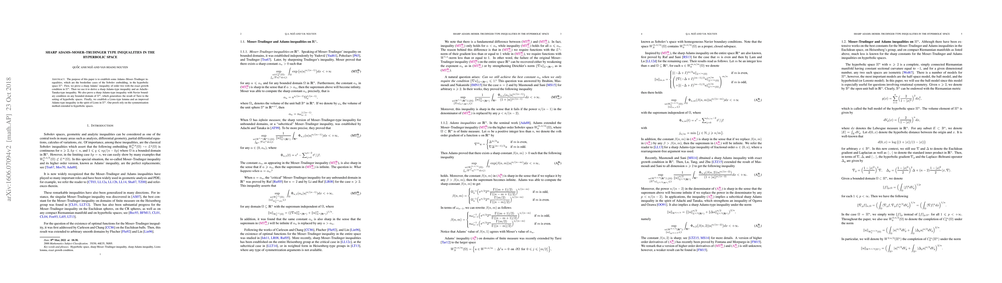 This paper establishes sharp Adams-Moser-Trudinger inequalities in hyperbolic space $\mathbb H^n$, including a sharp Adams inequality of order two, a sharp Adams-type inequality, and an Adachi-Tanaka-type inequality. It also generalizes results to bounded domains with Navier boundary conditions and proves a Lions-type lemma, using symmetrization methods adapted to hyperbolic spaces.