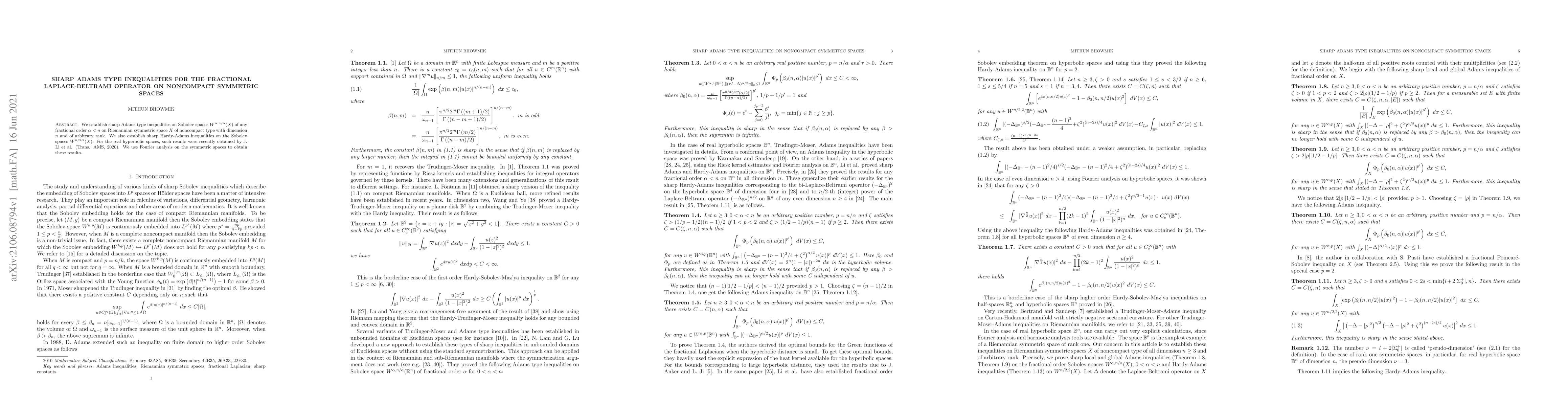 This paper establishes sharp Adams type inequalities for the fractional Laplace-Beltrami operator on noncompact symmetric spaces, extending recent results for real hyperbolic spaces. The study utilizes Fourier analysis on symmetric spaces to derive these inequalities for Sobolev spaces of any fractional order.