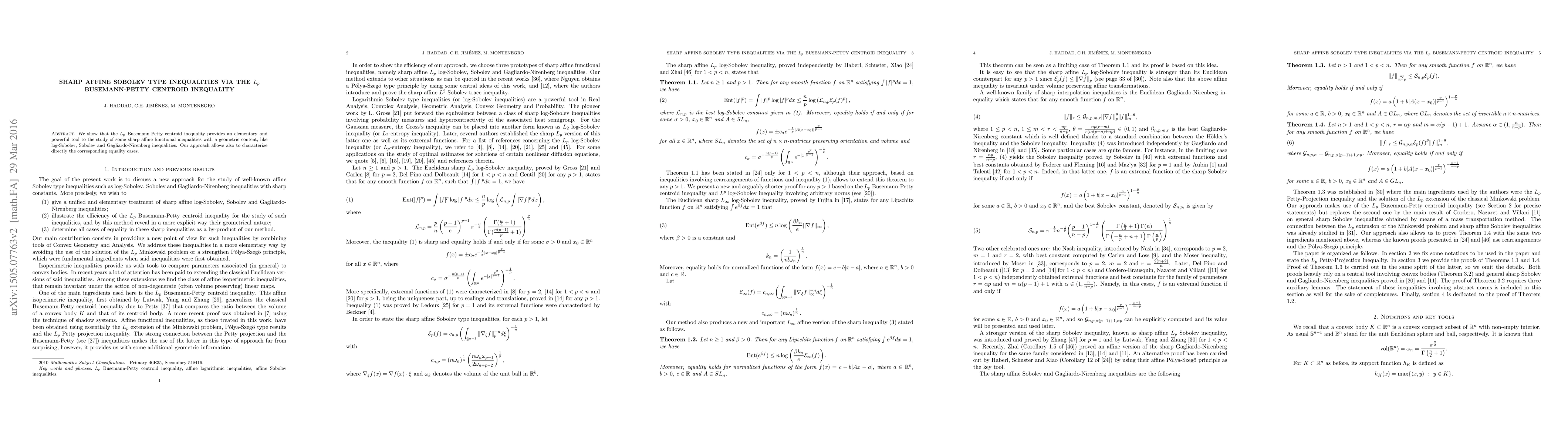 We show that the $\Lp$ Busemann-Petty centroid inequality provides an elementary and powerful tool to the study of some sharp affine functional inequalities with a geometric content, like log-Sobolev, Sobolev and Gagliardo-Nirenberg inequalities. Our approach allows also to characterize directly the corresponding equality cases.