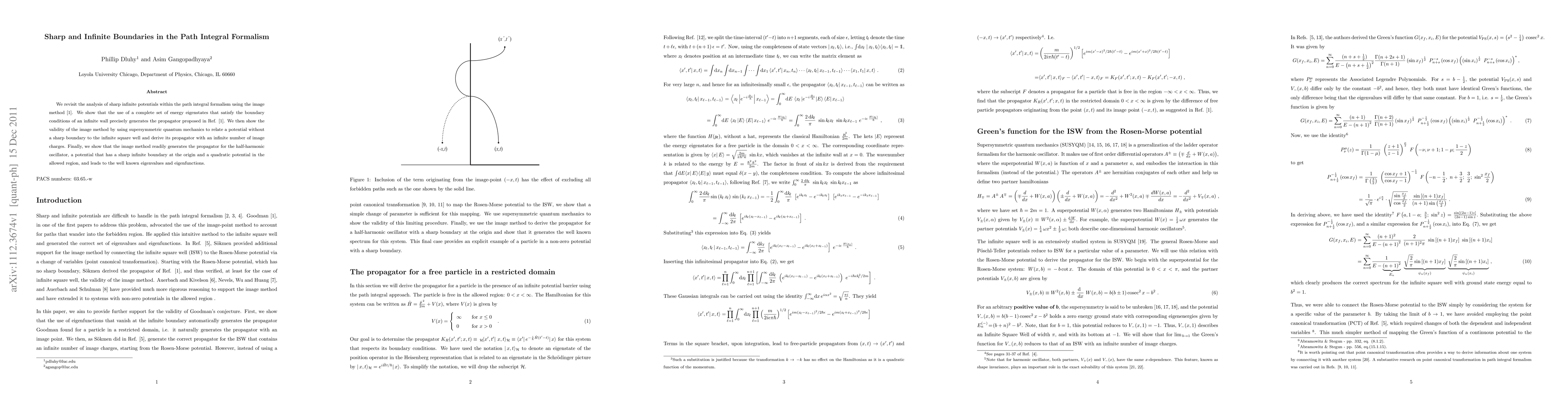 We revisit the analysis of sharp infinite potentials within the path integral formalism using the image method [1]. We show that the use of a complete set of energy eigenstates that satisfy the boundary conditions of an infinite wall precisely generates the propagator proposed in Ref. [1]. We then show the validity of the image method by using supersymmetric quantum mechanics to relate a potential without a sharp boundary to the infinite square well and derive its propagator with an infinite number of image charges. Finally, we show that the image method readily generates the propagator for the half-harmonic oscillator, a potential that has a sharp infinite boundary at the origin and a quadratic potential in the allowed region, and leads to the well known eigenvalues and eigenfunctions.