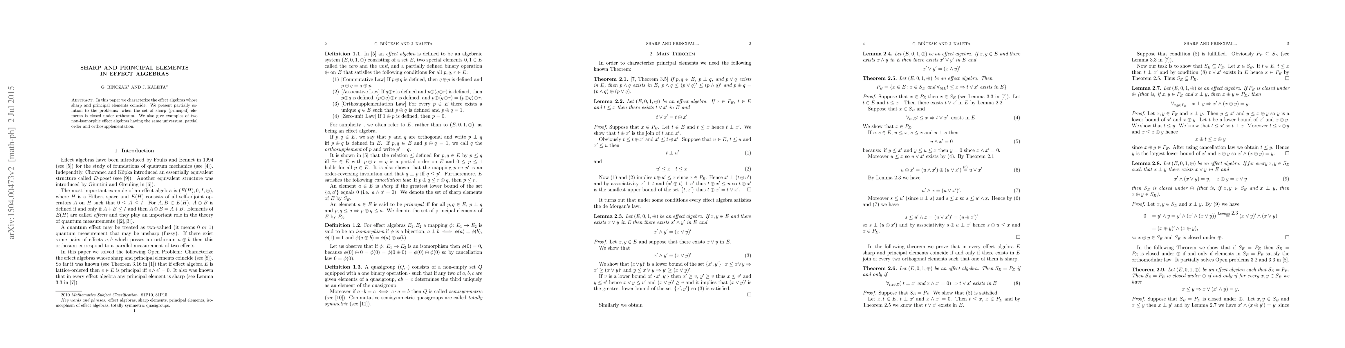 Summary: The paper characterizes effect algebras where sharp and principal elements are identical, and presents examples of two non-isomorphic effect algebras sharing the same universe, partial order, and orthosupplementation.