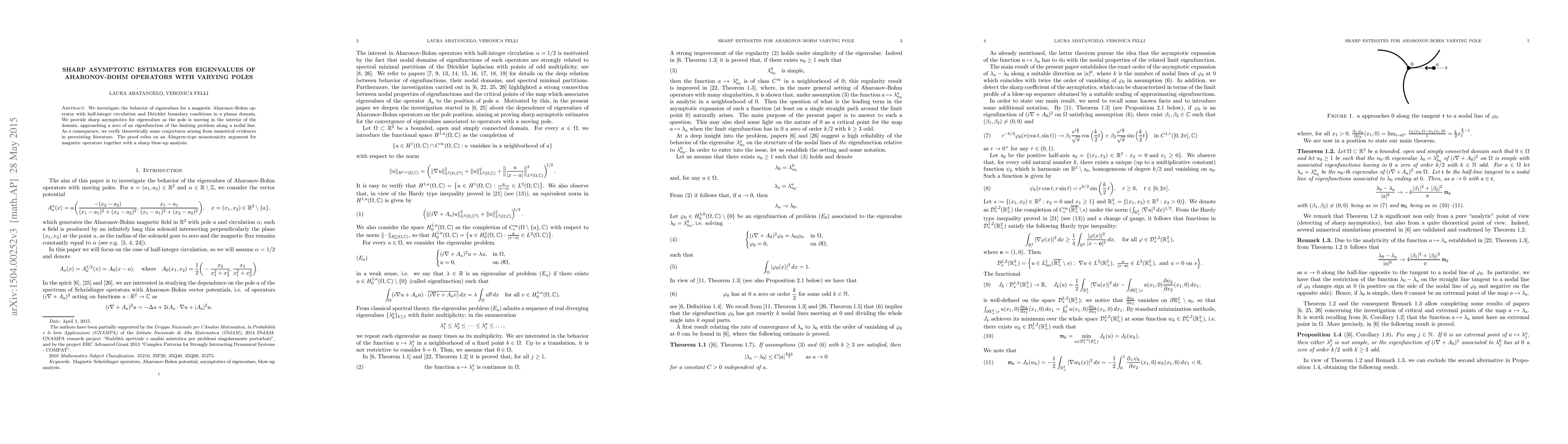 This paper studies the eigenvalues of Aharonov-Bohm operators with varying magnetic poles, providing sharp asymptotic estimates as the pole approaches a nodal line. The research verifies theoretical conjectures based on numerical evidence using an Almgren-type monotonicity argument and blow-up analysis.