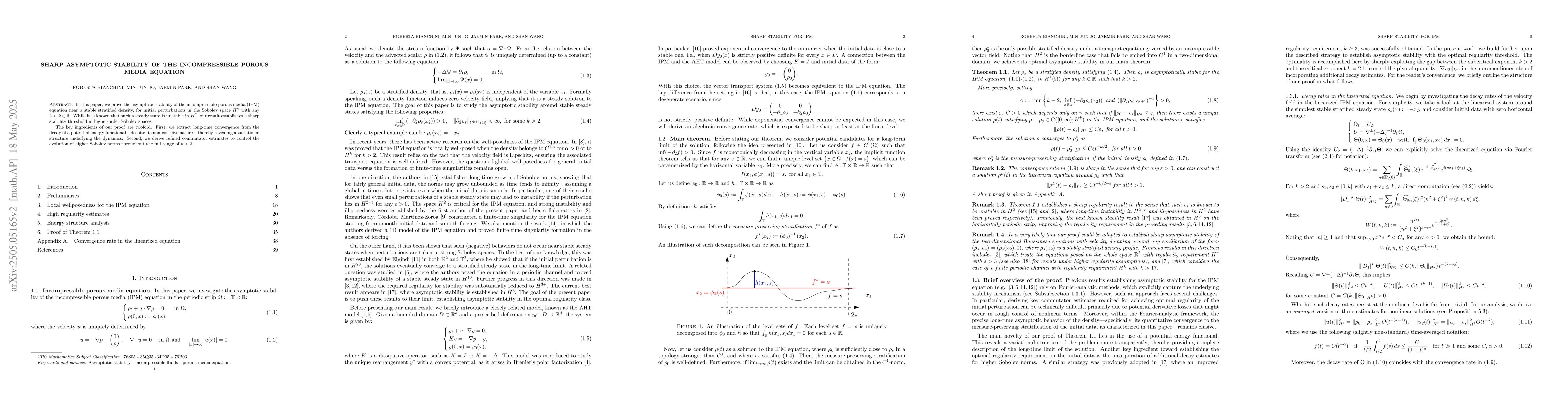 The paper proves the asymptotic stability of the incompressible porous media equation in higher-order Sobolev spaces, establishing a sharp stability threshold beyond $H^2$.