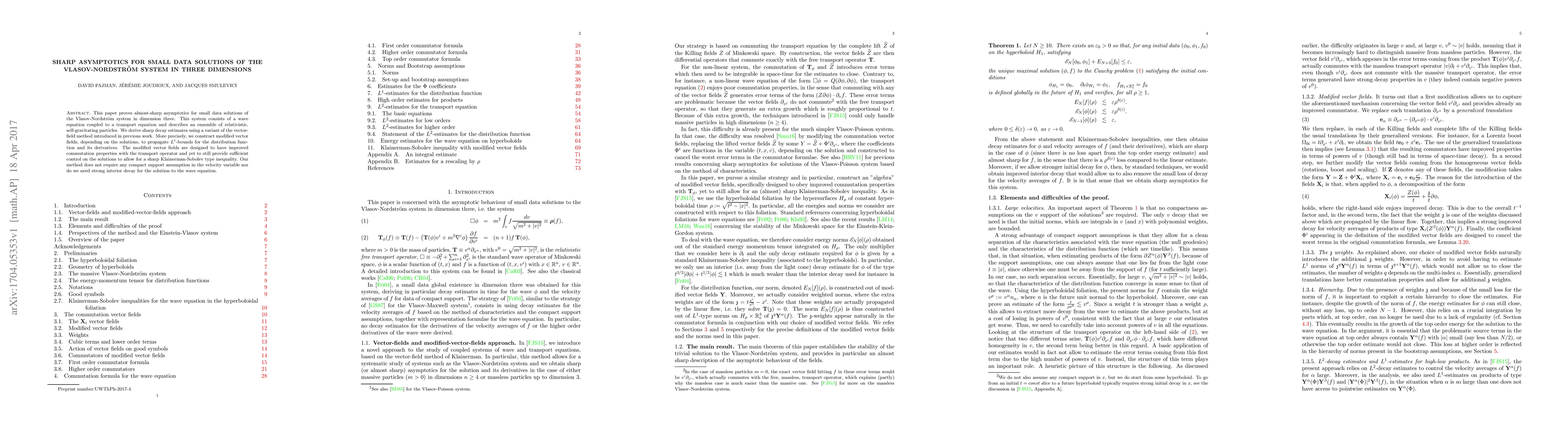 This paper proves almost-sharp asymptotics for small data solutions of the Vlasov-Nordstr\"om system in dimension three. This system consists of a wave equation coupled to a transport equation and describes an ensemble of relativistic, self-gravitating particles. We derive sharp decay estimates using a variant of the vector-field method introduced in previous work. More precisely, we construct modified vector fields, depending on the solutions, to propagate $L^1$-bounds for the distribution function and its derivatives. The modified vector fields are designed to have improved commutation properties with the transport operator and yet to still provide sufficient control on the solutions to allow for a sharp Klainerman-Sobolev type inequality. Our method does not require any compact support assumption in the velocity variable nor do we need strong interior decay for the solution to the wave equation.