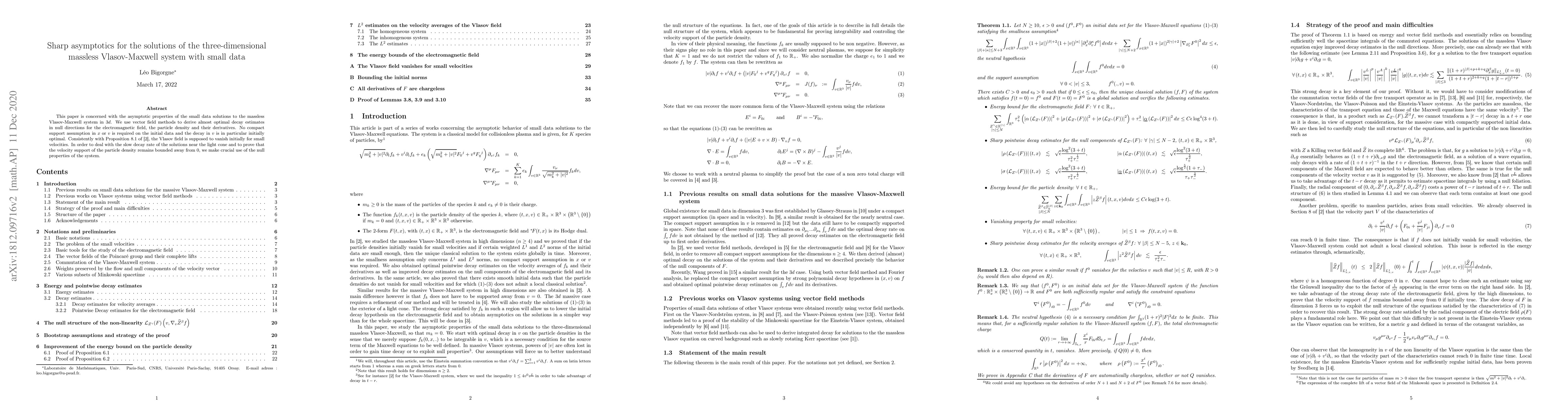 This paper investigates the asymptotic behavior of small data solutions to the three-dimensional massless Vlasov-Maxwell system, deriving almost optimal decay estimates for the electromagnetic field and particle density using vector field methods. The analysis does not require compact support for initial data and achieves initially optimal decay in velocity, leveraging the null properties of the system to manage slow decay near the light cone.