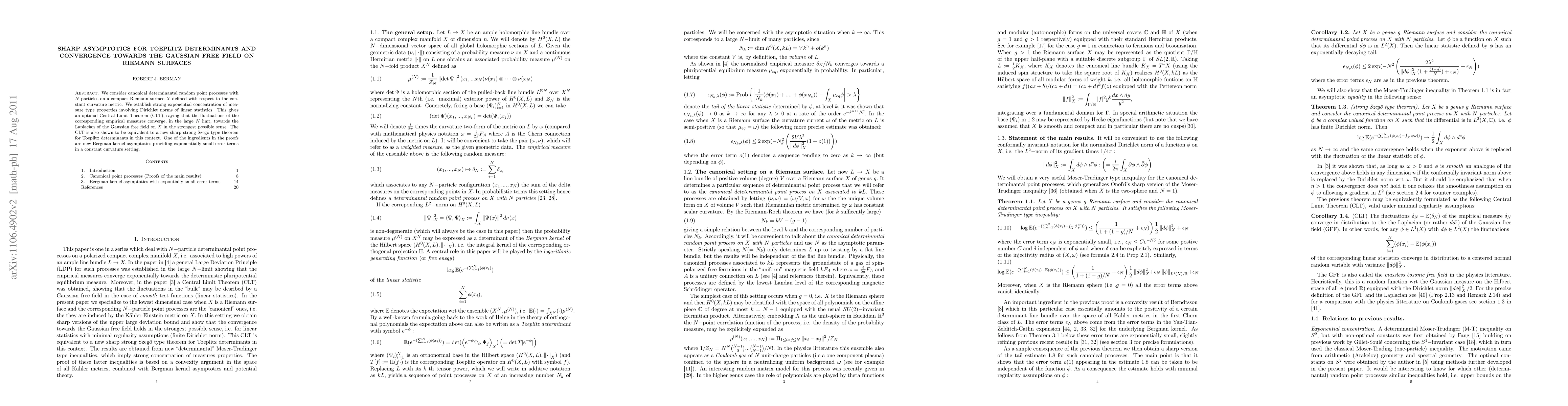 We consider canonical determinantal random point processes with N particles on a compact Riemann surface X defined with respect to the constant curvature metric. In the higher genus (hyperbolic) cases these point processes may be defined in terms of automorphic forms. We establish strong exponential concentration of measure type properties involving Dirichlet norms of linear statistics. This gives an optimal Central Limit Theorem (CLT), saying that the fluctuations of the corresponding empirical measures converge, in the large N limt, towards the Laplacian of the Gaussian free field on X in the strongest possible sense. The CLT is also shown to be equivalent to a new sharp strong Szeg\"o type theorem for Toeplitz determinants in this context. One of the ingredients in the proofs are new Bergman kernel asymptotics providing exponentially small error terms in a constant curvature setting.