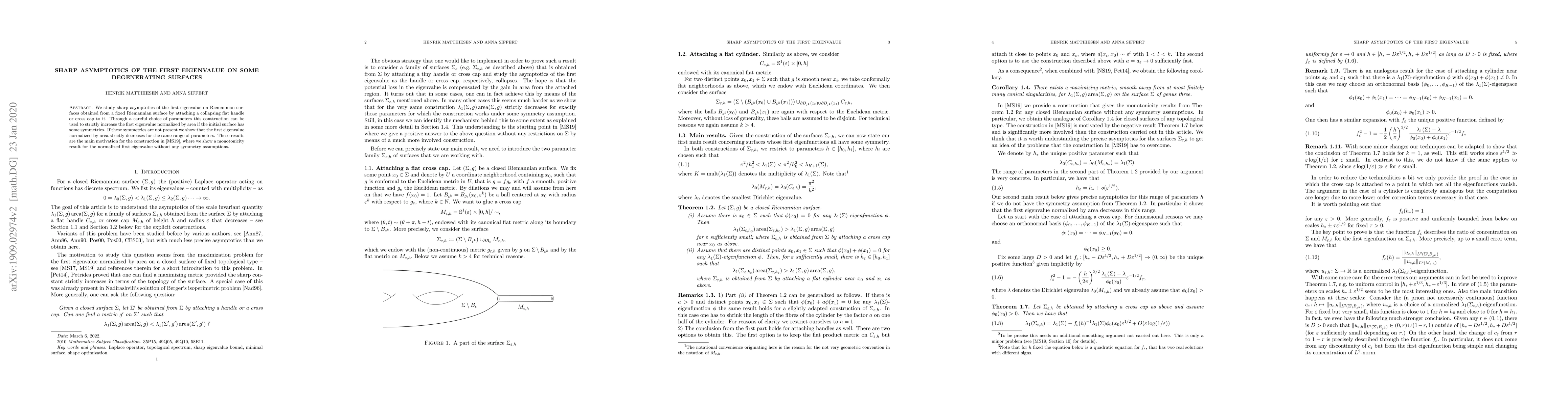 This paper investigates the asymptotic behavior of the first eigenvalue on Riemannian surfaces formed by attaching a collapsing flat handle or cross cap to a base surface. It demonstrates that the first eigenvalue normalized by area can increase or decrease depending on the initial surface's symmetry, leading to a monotonicity result in a subsequent study without symmetry assumptions.