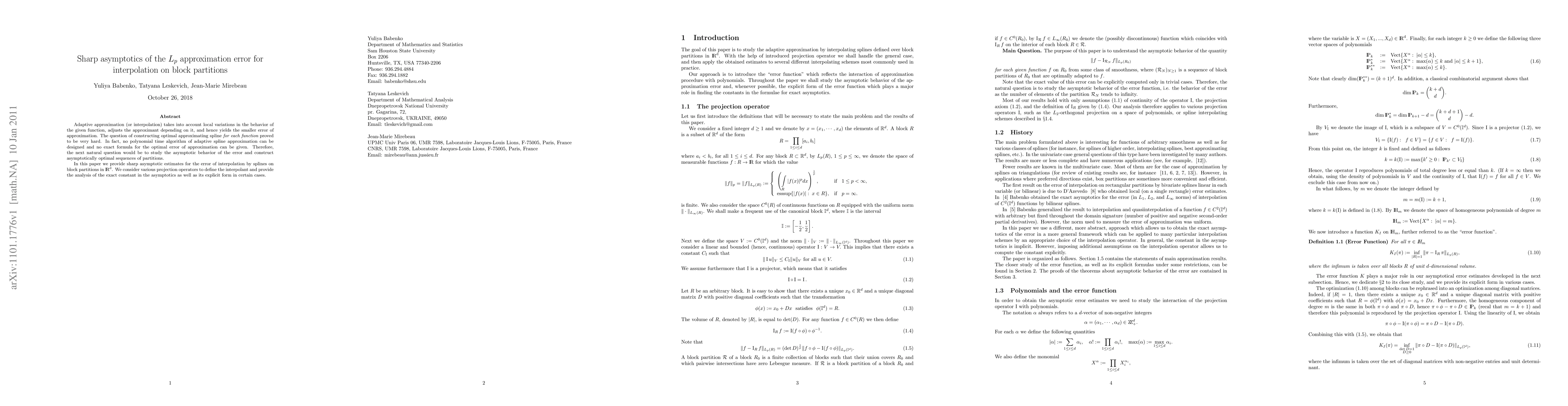This paper investigates the asymptotic behavior of Lp approximation error for interpolation using block partitions, providing sharp estimates for the error of spline interpolation. It explores various projection operators and analyzes the exact constant in the asymptotics, offering explicit forms in specific cases.
