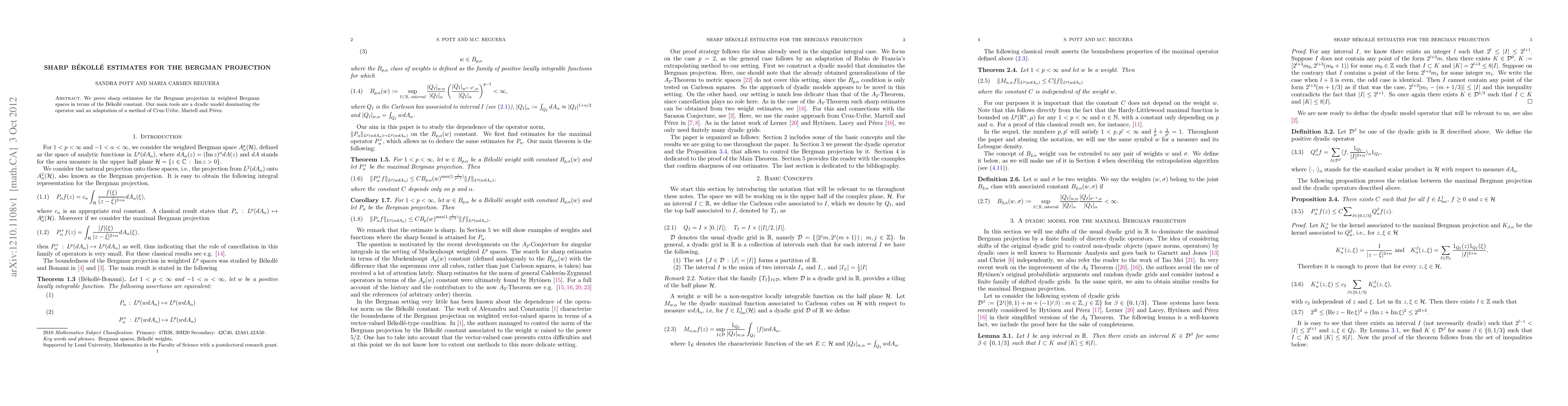 Summary: This paper establishes sharp estimates for the Bergman projection in weighted Bergman spaces using the Bekolle constant, employing a dyadic model and adapting a method from Cruz-Uribe, Martell, and Perez.