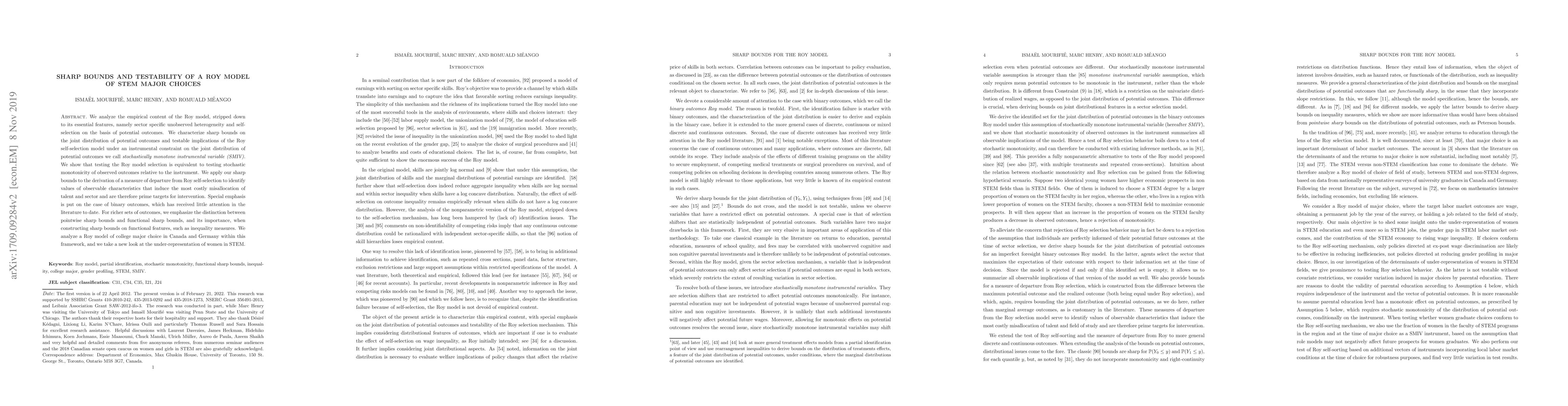 This research paper analyzes the Roy model of STEM major choices, providing sharp bounds on potential outcomes and testable implications under a stochastically monotone instrumental variable (SMIV). It highlights the equivalence of testing Roy model selection to testing SMIV's monotonicity, and applies these bounds to identify misallocation targets for intervention, particularly focusing on the under-representation of women in STEM fields in Canada and Germany.