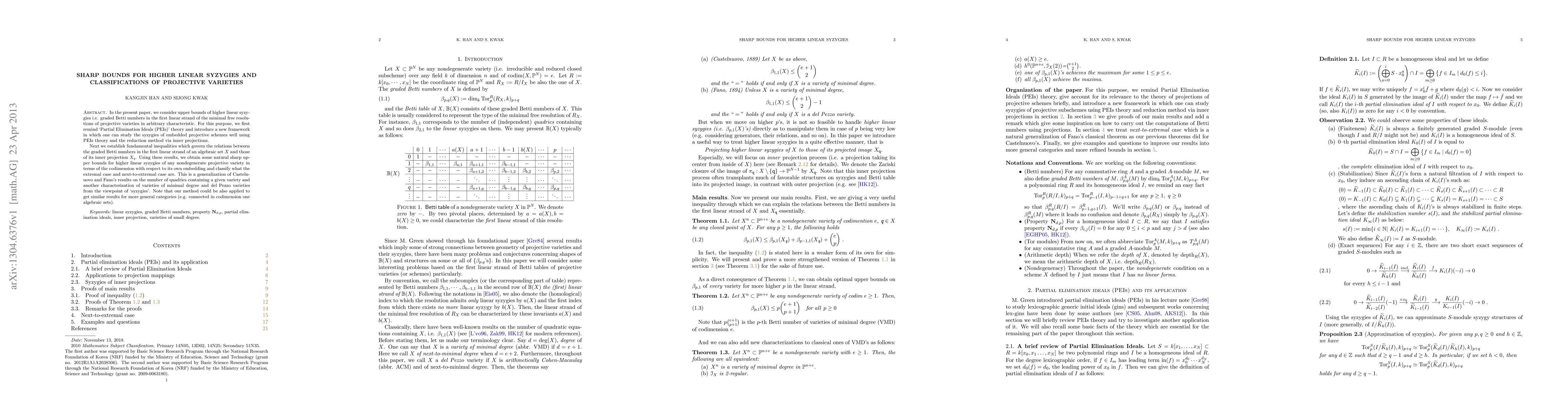 This paper establishes sharp upper bounds for higher linear syzygies of projective varieties using Partial Elimination Ideals theory and introduces a new framework for analyzing embedded projective schemes. The authors derive fundamental inequalities and classify extremal cases, generalizing prior results on the number of quadrics containing a variety and characterizing minimal degree and del Pezzo varieties through syzygies.