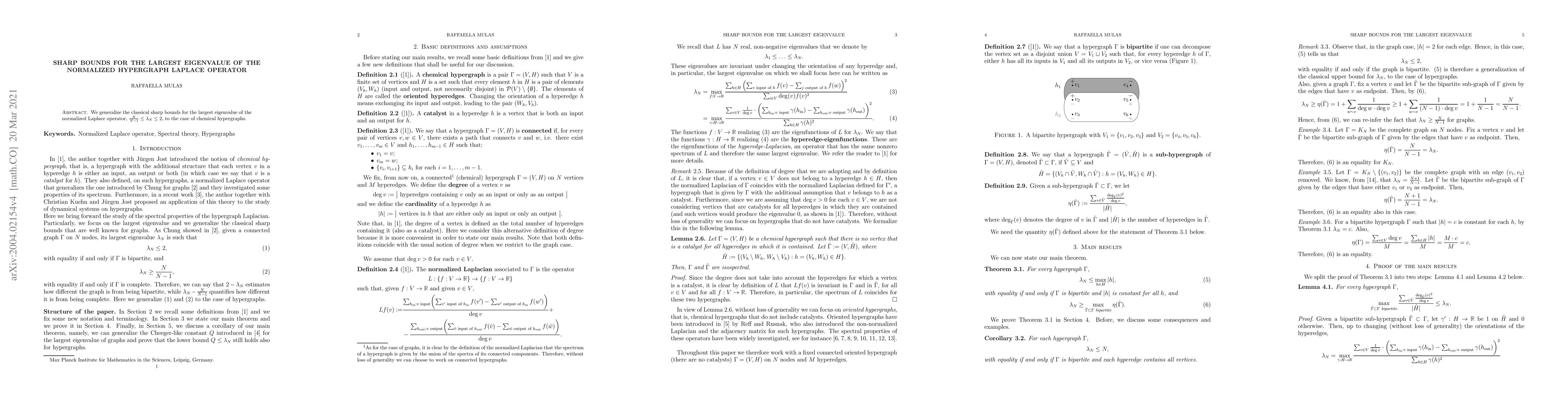 Summary: This paper generalizes the classical sharp bounds for the largest eigenvalue of the normalized Laplace operator, $\frac{N}{N-1}\leq \lambda_N\leq 2$, to chemical hypergraphs, providing new insights into their spectral properties.