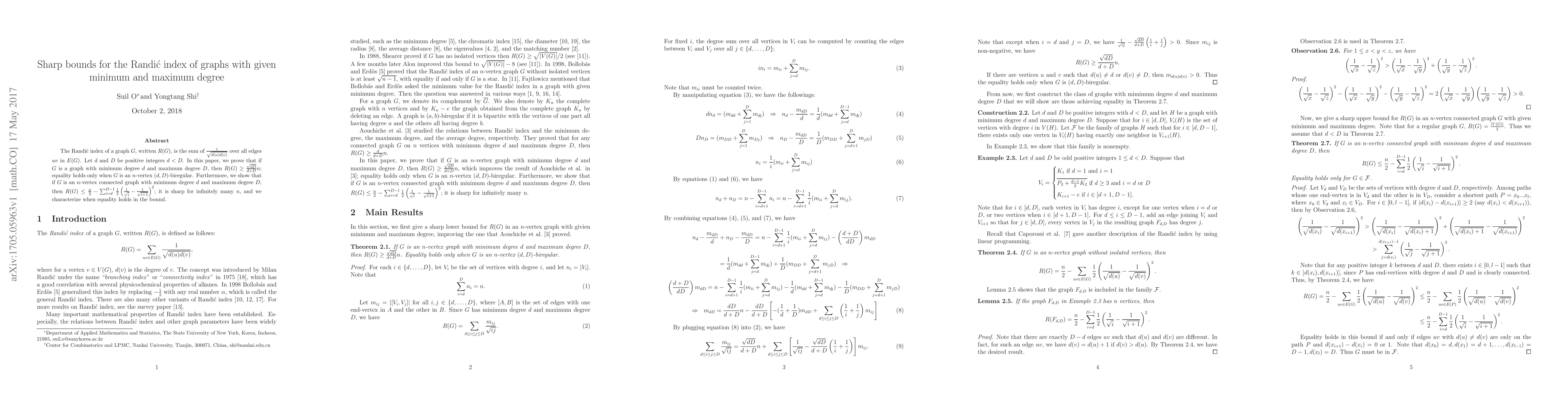 Researchers proved bounds for the Randic index of graphs with given minimum and maximum degree, showing that it is at least rac{ ext{min degree} imes ext{max degree}}{ ext{min degree} + ext{max degree}} times the number of vertices, and at most a specific expression involving the degrees.