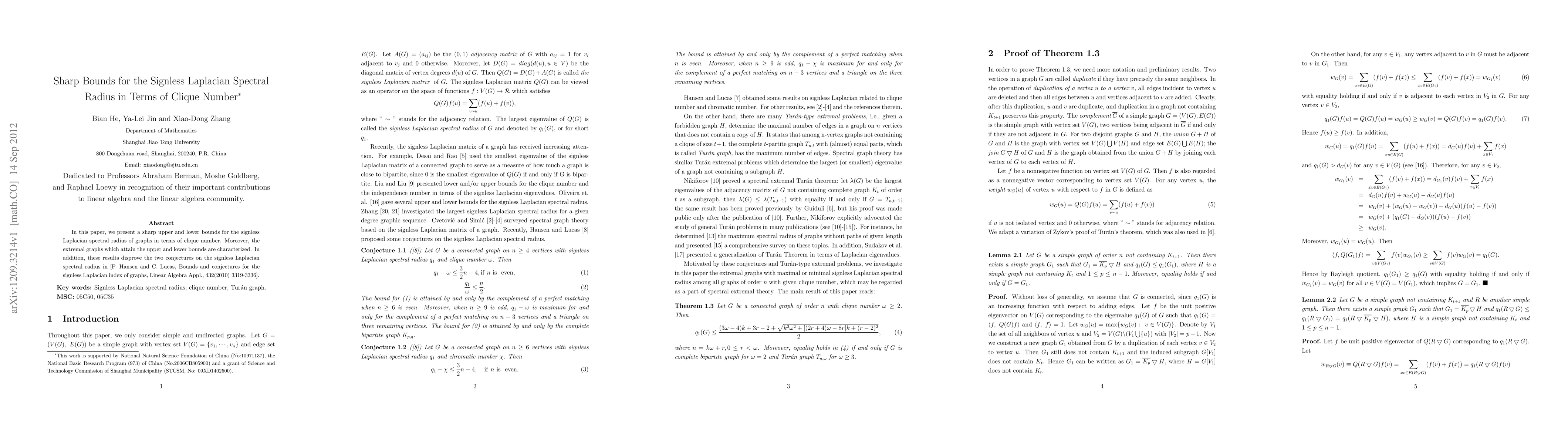 This paper establishes precise upper and lower bounds for the signless Laplacian spectral radius of graphs in relation to their clique number, and identifies the extremal graphs that achieve these bounds. It also refutes two conjectures previously proposed by Hansen and Lucas.
