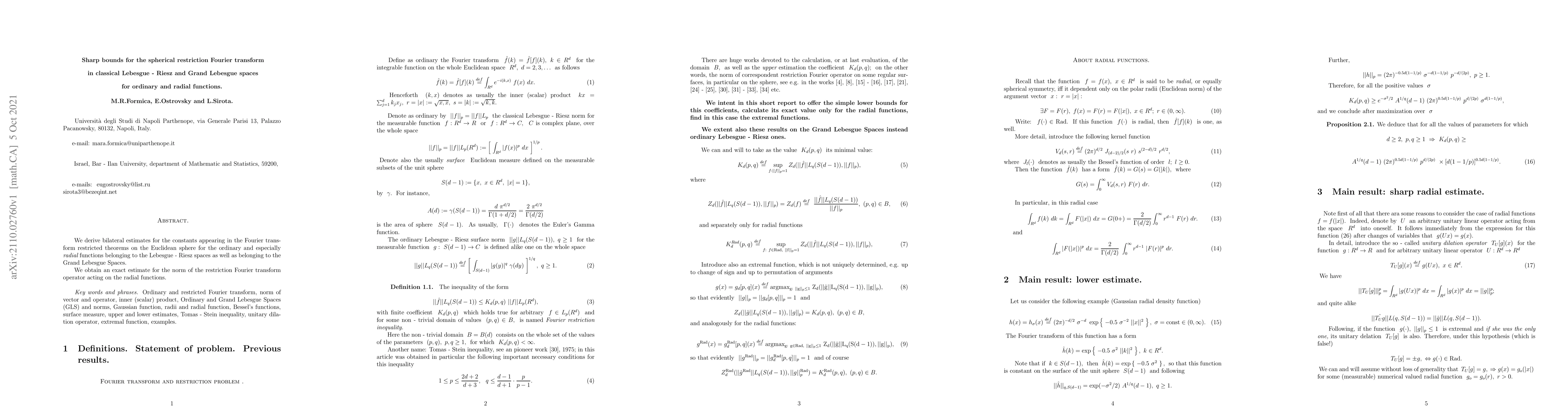 We derive bilateral estimates for the constants appearing in the Fourier transform restricted theorems on the Euclidean sphere for the ordinary and especially radial functions belonging to the Lebesgue-Riesz spaces as well as belonging to the Grand Lebesgue Spaces. We obtain an exact estimate for the norm of the restriction Fourier transform operator acting on the radial functions.