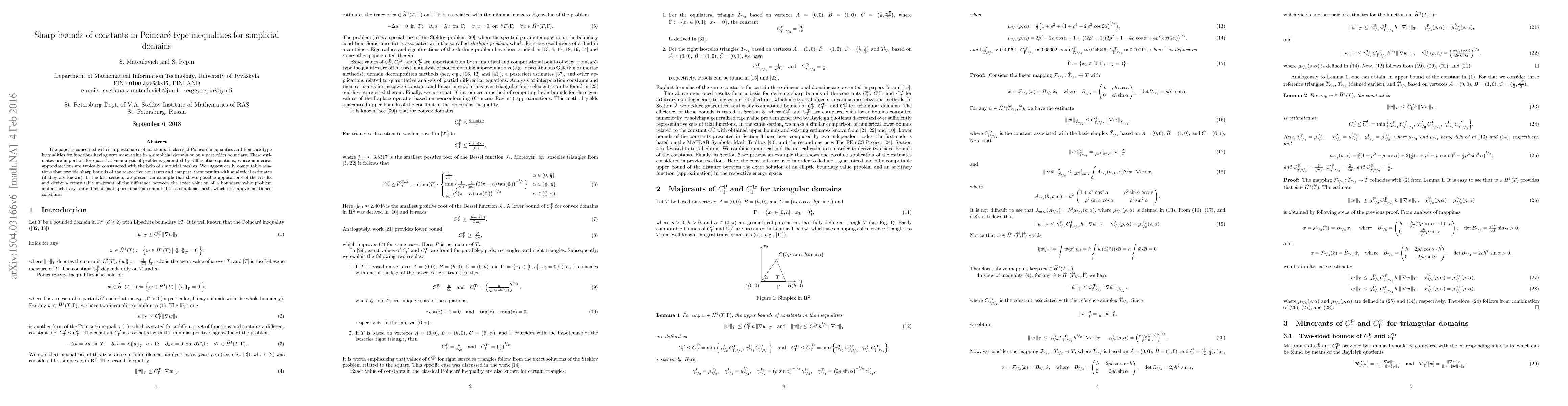 Researchers found sharp bounds for constants in Poincare type inequalities for functions on simplexes in 2D and 3D, improving error estimation methods for partial differential equations.