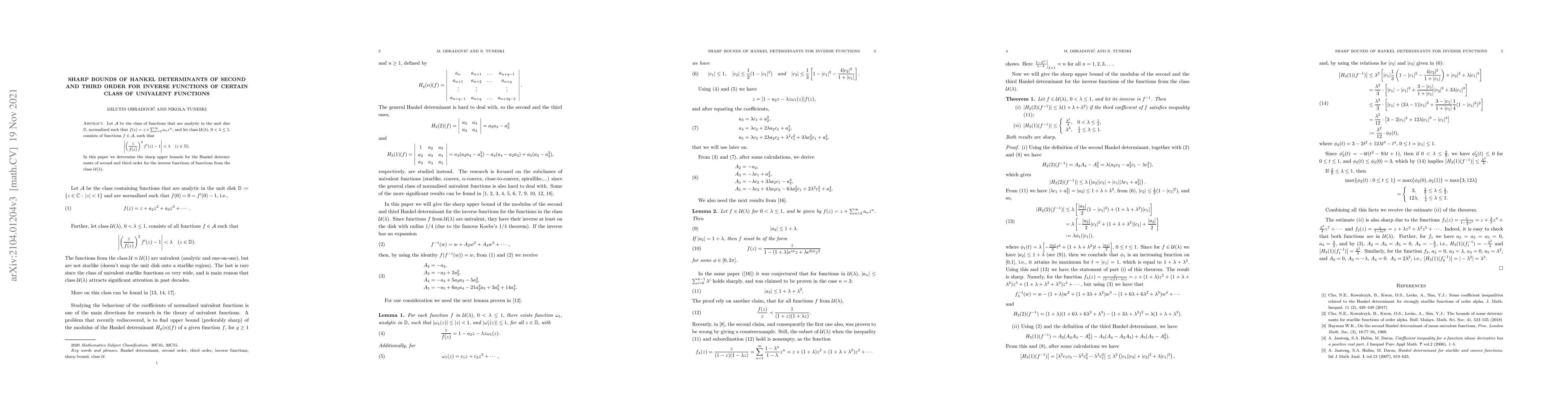 This paper investigates the sharp upper bounds for the second and third order Hankel determinants of inverse functions belonging to a specific class ${\mathcal U}(\lambda)$ of univalent functions in the unit disc, defined by a given distortion condition. The study focuses on functions normalized by $f(z)=z+\sum_{n=2}^\infty a_nz^n$.