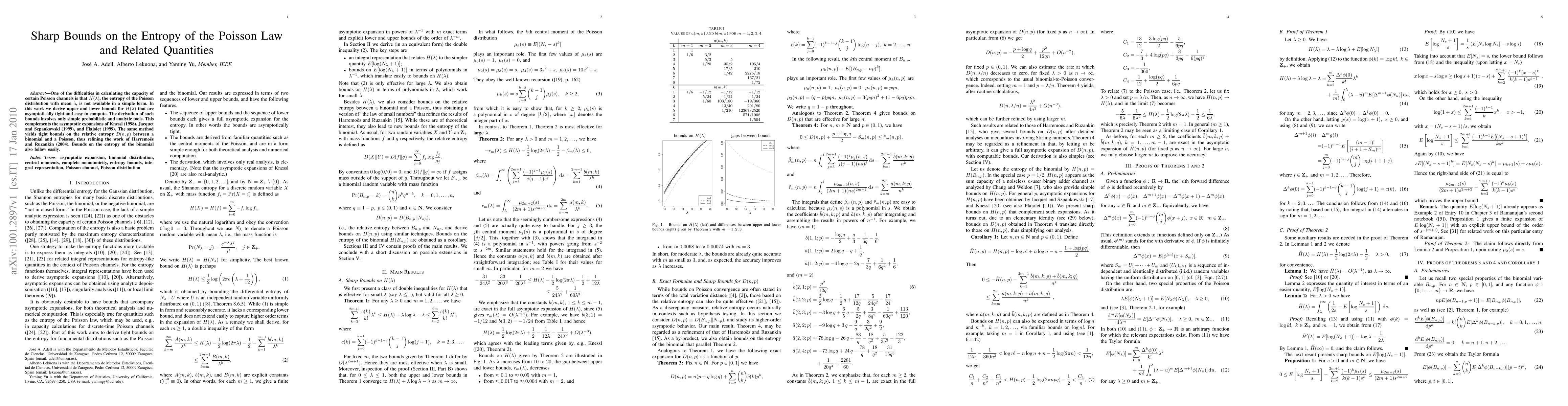 One of the difficulties in calculating the capacity of certain Poisson channels is that H(lambda), the entropy of the Poisson distribution with mean lambda, is not available in a simple form. In this work we derive upper and lower bounds for H(lambda) that are asymptotically tight and easy to compute. The derivation of such bounds involves only simple probabilistic and analytic tools. This complements the asymptotic expansions of Knessl (1998), Jacquet and Szpankowski (1999), and Flajolet (1999). The same method yields tight bounds on the relative entropy D(n, p) between a binomial and a Poisson, thus refining the work of Harremoes and Ruzankin (2004). Bounds on the entropy of the binomial also follow easily.