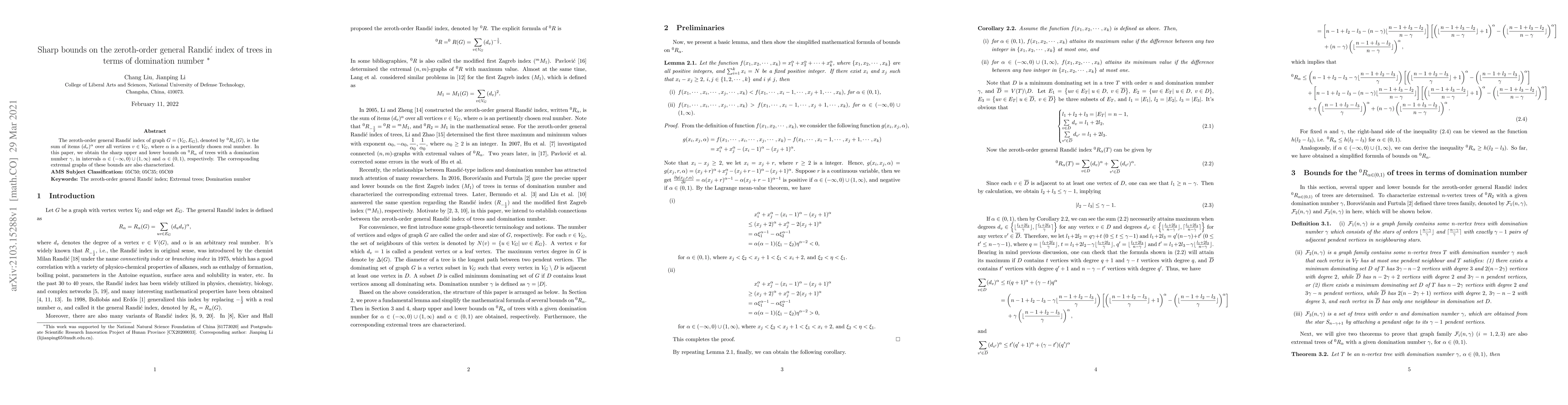 The zeroth-order general Randi\'c index of graph $G=(V_G,E_G)$, denoted by $^0R_{\alpha}(G)$, is the sum of items $(d_{v})^{\alpha}$ over all vertices $v\in V_G$, where $\alpha$ is a pertinently chosen real number. In this paper, we obtain the sharp upper and lower bounds on $^0R_{\alpha}$ of trees with a domination number $\gamma$, in intervals $\alpha\in(-\infty,0)\cup(1,\infty)$ and $\alpha\in(0,1)$, respectively. The corresponding extremal graphs of these bounds are also characterized.