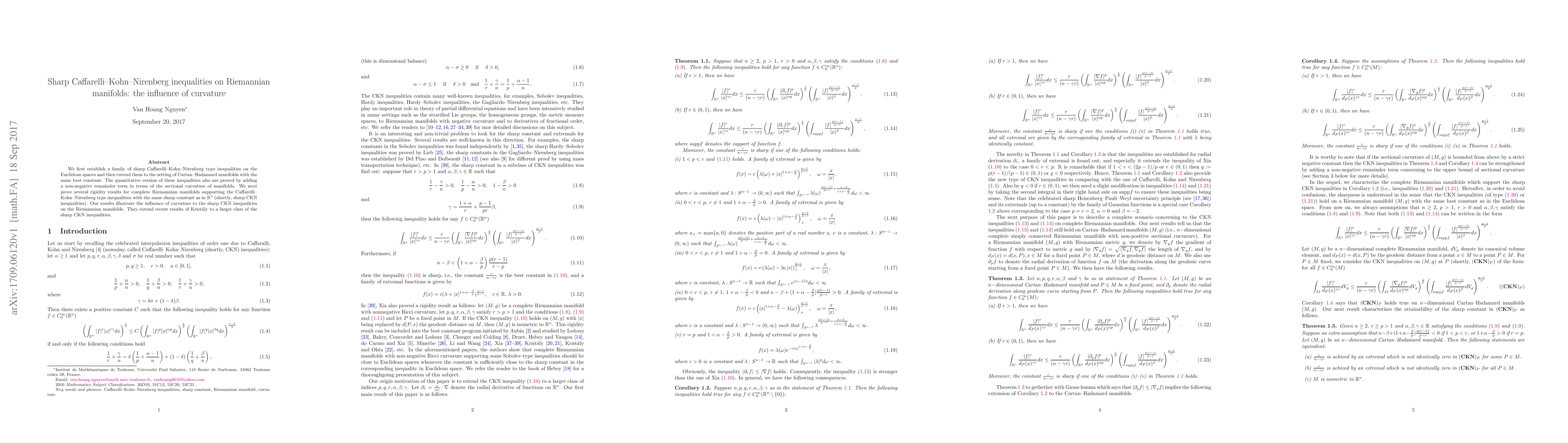 This paper establishes sharp Caffarelli-Kohn-Nirenberg (CKN) inequalities on Euclidean spaces and extends them to Cartan-Hadamard manifolds, showing how sectional curvature affects these inequalities. It also proves rigidity results for complete Riemannian manifolds supporting these sharp CKN inequalities.