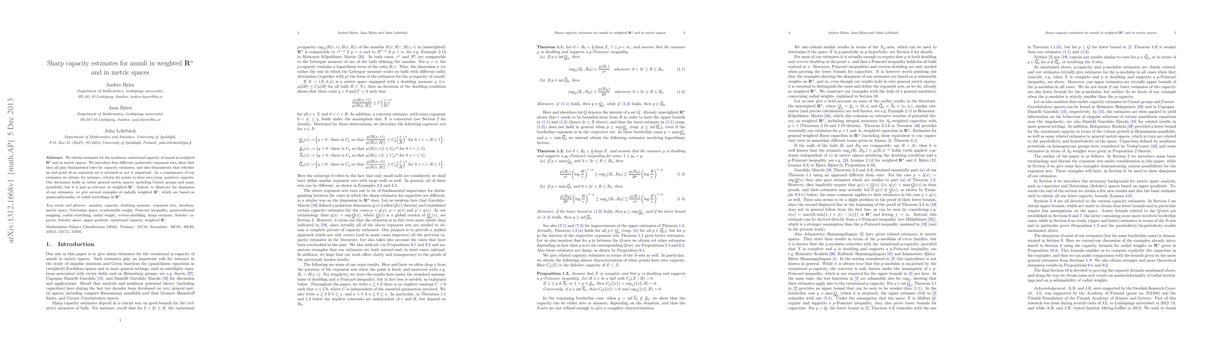 We obtain estimates for the nonlinear variational capacity of annuli in weighted R^n and in metric spaces. We introduce four different (pointwise) exponent sets, show that they all play fundamental roles for capacity estimates, and also demonstrate that whether an end point of an exponent set is attained or not is important. As a consequence of our estimates we obtain, for instance, criteria for points to have zero (resp. positive) capacity. Our discussion holds in rather general metric spaces, including Carnot groups and many manifolds, but it is just as relevant on weighted R^n. Indeed, to illustrate the sharpness of our estimates, we give several examples of radially weighted R^n, which are based on quasiconformality of radial stretchings in R^n.