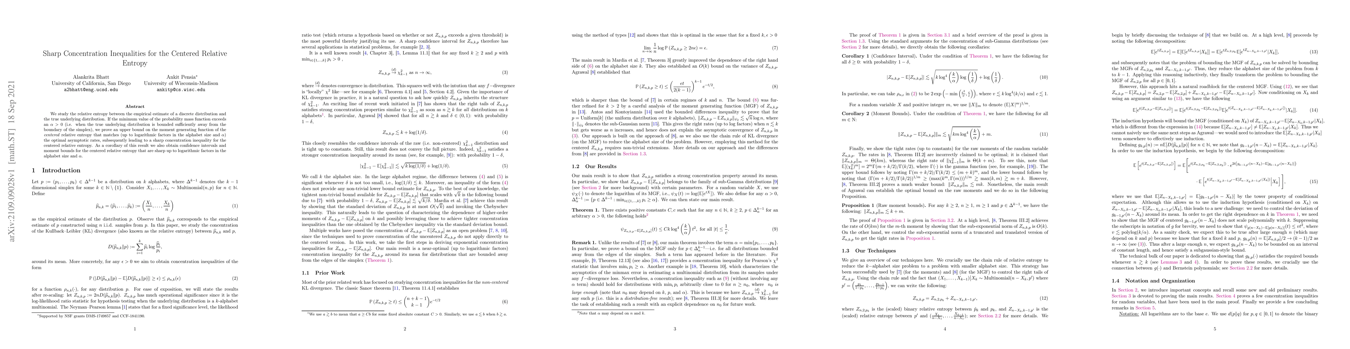 Researchers prove an upper bound on the moment generating function of centered relative entropy, leading to a sharp concentration inequality for this measure, with implications for confidence intervals and moment bounds.