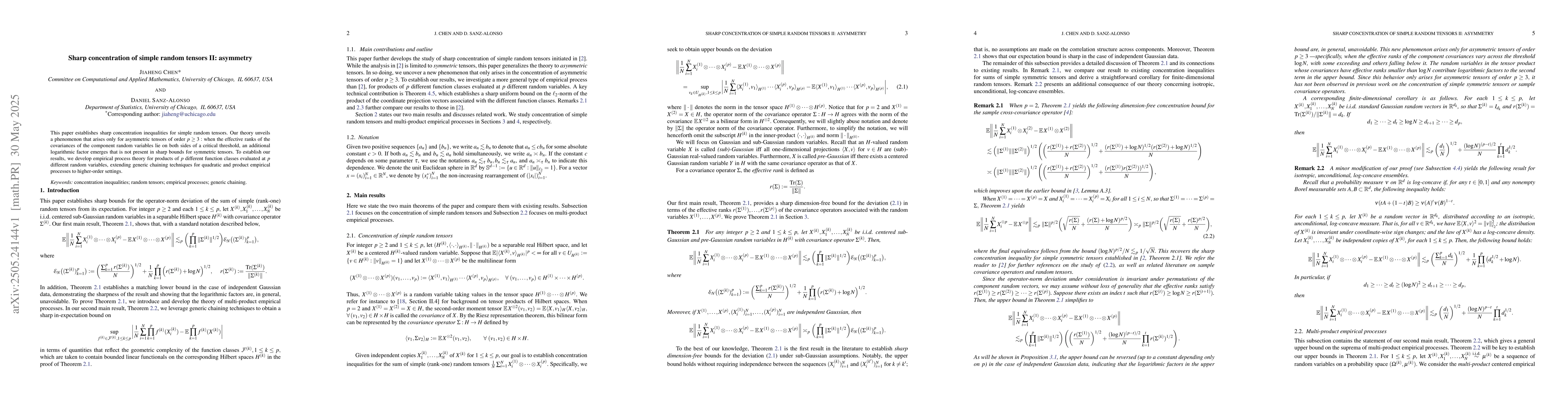 Research establishes sharp concentration inequalities for simple random tensors of order $p geq 3$, revealing an additional logarithmic factor for asymmetric tensors beyond a certain critical threshold.
