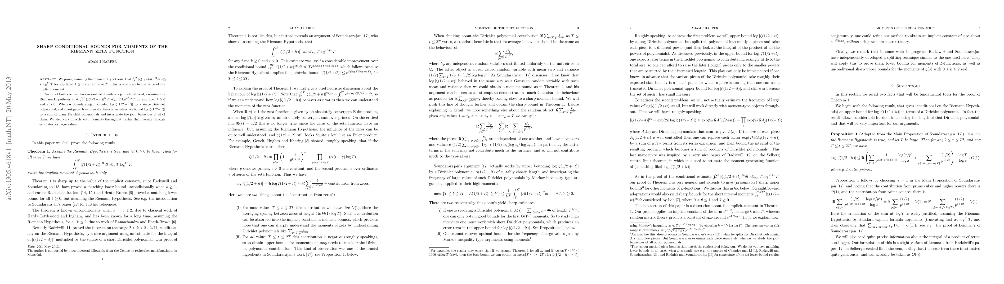 We prove, assuming the Riemann Hypothesis, that \int_{T}^{2T} |\zeta(1/2+it)|^{2k} dt \ll_{k} T log^{k^{2}} T for any fixed k \geq 0 and all large T. This is sharp up to the value of the implicit constant. Our proof builds on well known work of Soundararajan, who showed, assuming the Riemann Hypothesis, that \int_{T}^{2T} |\zeta(1/2+it)|^{2k} dt \ll_{k,\epsilon} T log^{k^{2}+\epsilon} T for any fixed k \geq 0 and \epsilon > 0. Whereas Soundararajan bounded \log|\zeta(1/2+it)| by a single Dirichlet polynomial, and investigated how often it attains large values, we bound \log|\zeta(1/2+it)| by a sum of many Dirichlet polynomials and investigate the joint behaviour of all of them. We also work directly with moments throughout, rather than passing through estimates for large values.