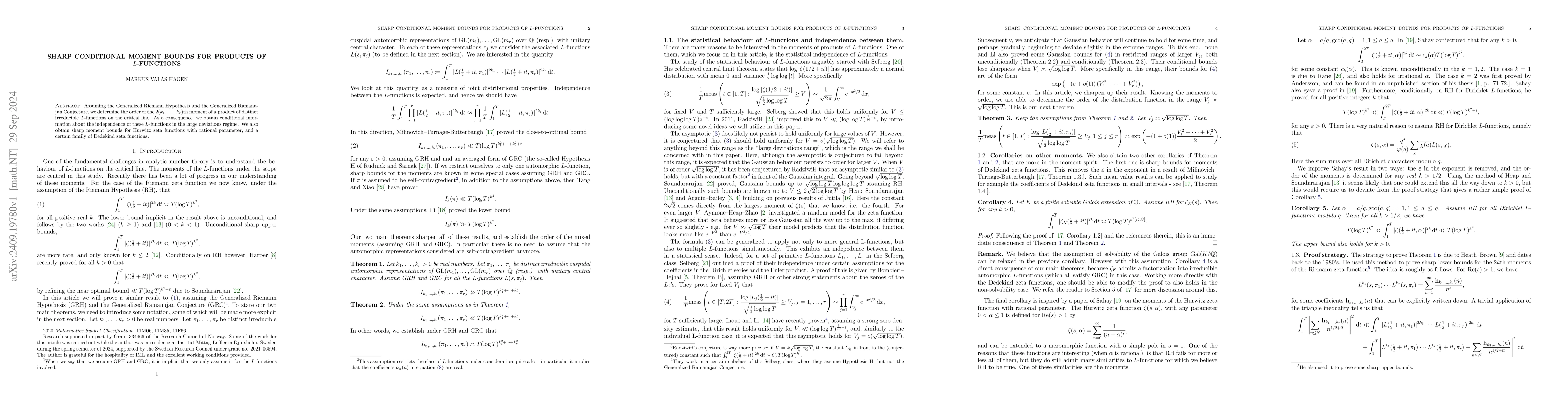 Assuming the Generalized Riemann Hypothesis and the Generalized Ramanujan Conjecture, we determine the order of the $2(k_1,\dots,k_r)$th moment of a product of distinct irreducible $L$-functions on the critical line. As a consequence, we obtain conditional information about the independence of these $L$-functions in the large deviations regime. We also obtain sharp moment bounds for Hurwitz zeta functions with rational parameter, and a certain family of Dedekind zeta functions.