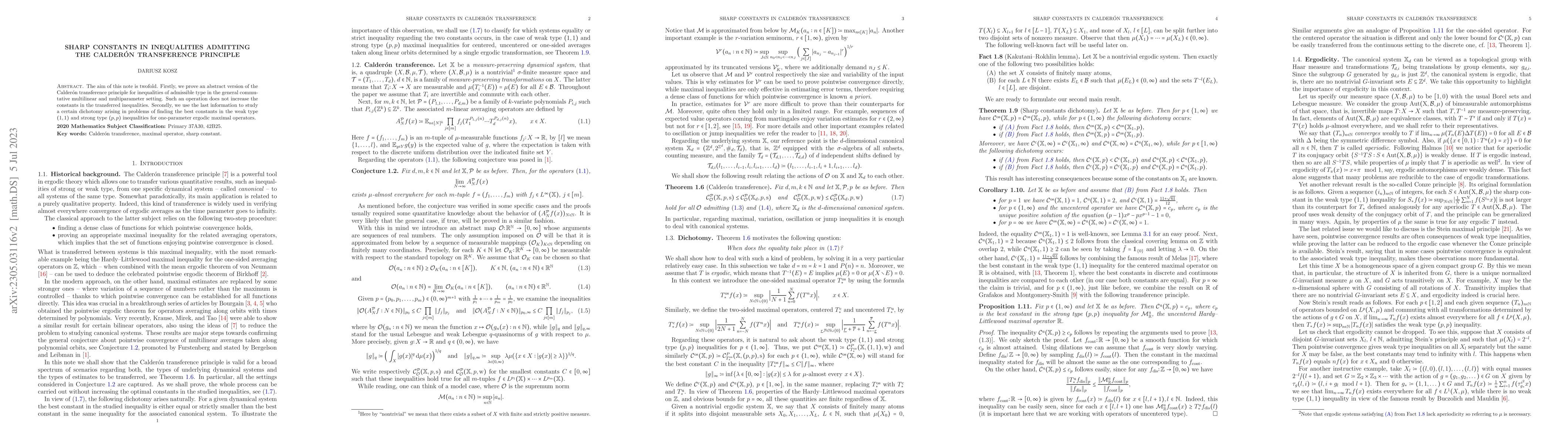 The aim of this note is twofold. Firstly, we prove an abstract version of the Calder\'on transference principle for inequalities of admissible type in the general commutative multilinear and multiparameter setting. Such an operation does not increase the constants in the transferred inequalities. Secondly, we use the last information to study a certain dichotomy arising in problems of finding the best constants in the weak type $(1,1)$ and strong type $(p,p)$ inequalities for one-parameter ergodic maximal operators.