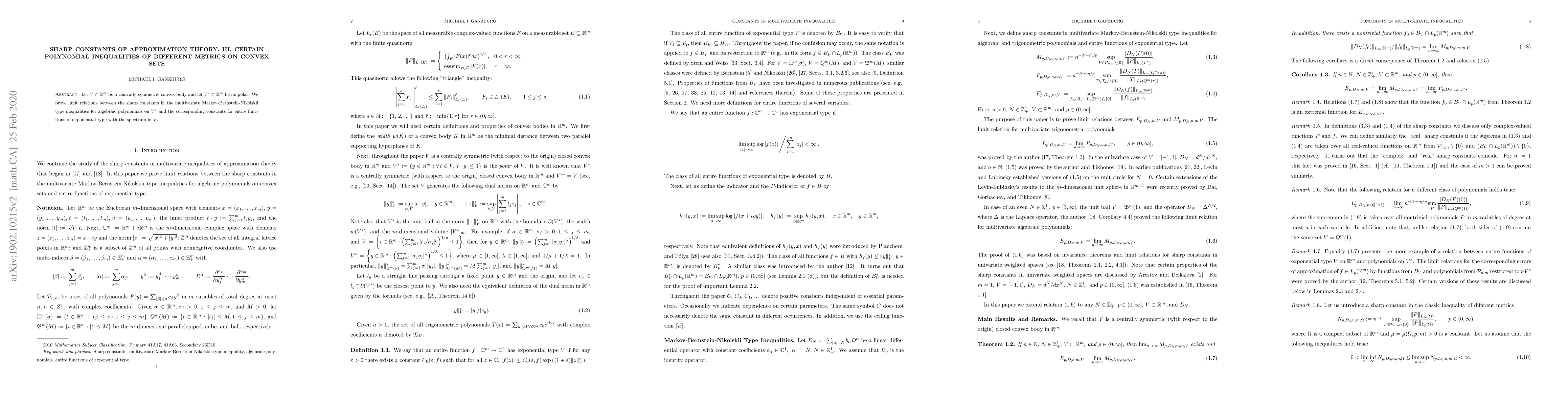 Let $V\subset\R^m$ be a centrally symmetric convex body and let $V^*\subset\R^m$ be its polar. We prove limit relations between the sharp constants in the multivariate Markov-Bernstein-Nikolskii type inequalities for algebraic polynomials on $V^*$ and the corresponding constants for entire functions of exponential type with the spectrum in $V$.