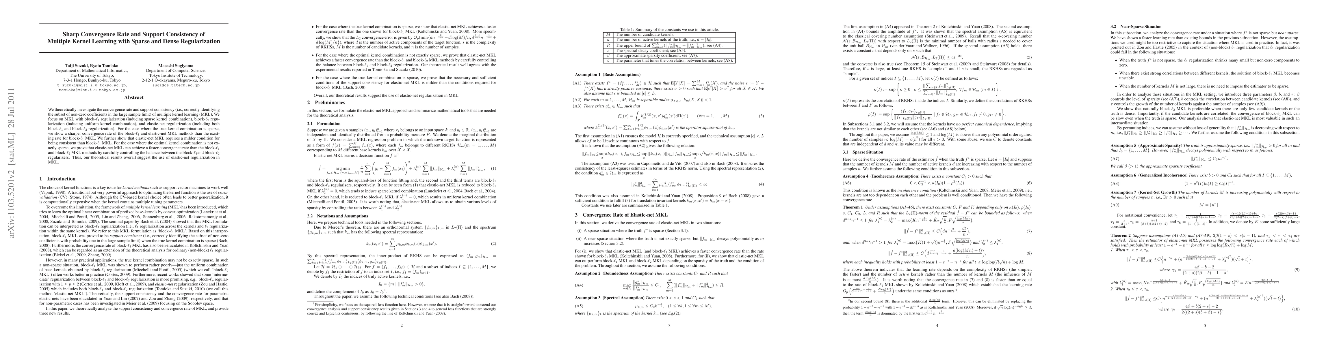 This paper investigates the convergence rate and support consistency of multiple kernel learning (MKL) with sparse and dense regularization. It demonstrates that elastic-net regularization achieves a sharper convergence rate and requires milder conditions for consistency compared to block-l1 and block-l2 regularization, especially in non-sparse scenarios.