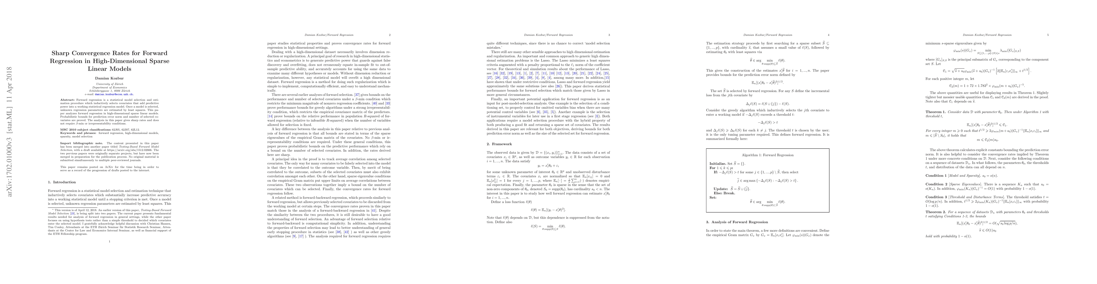 This paper investigates forward regression in high-dimensional sparse linear models, proving probabilistic bounds for prediction error and the number of selected covariates. It provides sharp convergence rates without requiring beta-min or irrepresentability conditions.
