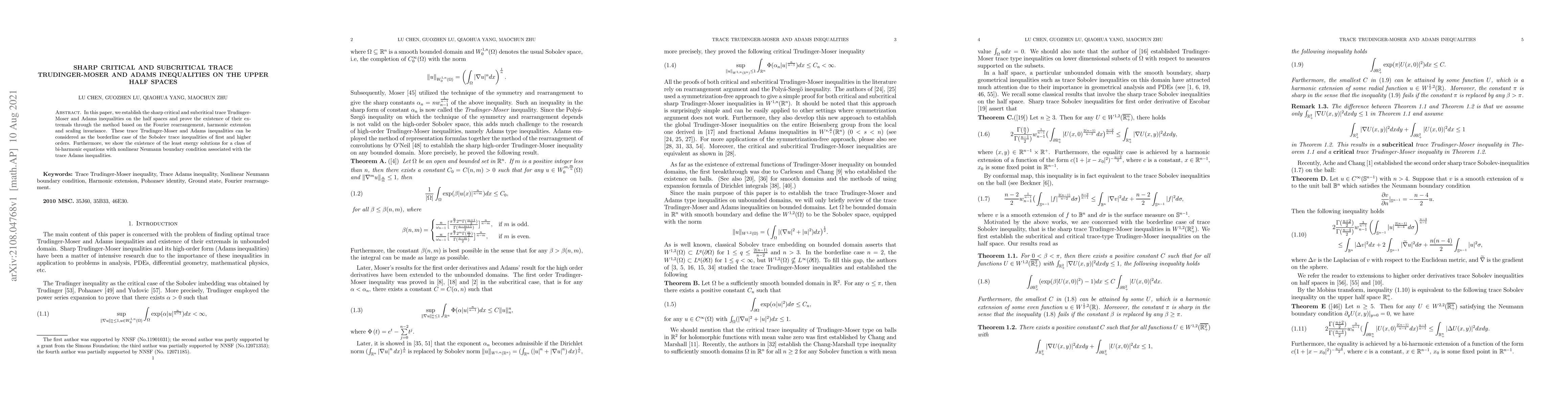 This paper establishes sharp critical and subcritical trace Trudinger-Moser and Adams inequalities on upper half spaces, proving the existence of extremals via Fourier rearrangement, harmonic extension, and scaling invariance. It also demonstrates the existence of least energy solutions for bi-harmonic equations with nonlinear Neumann boundary conditions linked to the trace Adams inequalities.