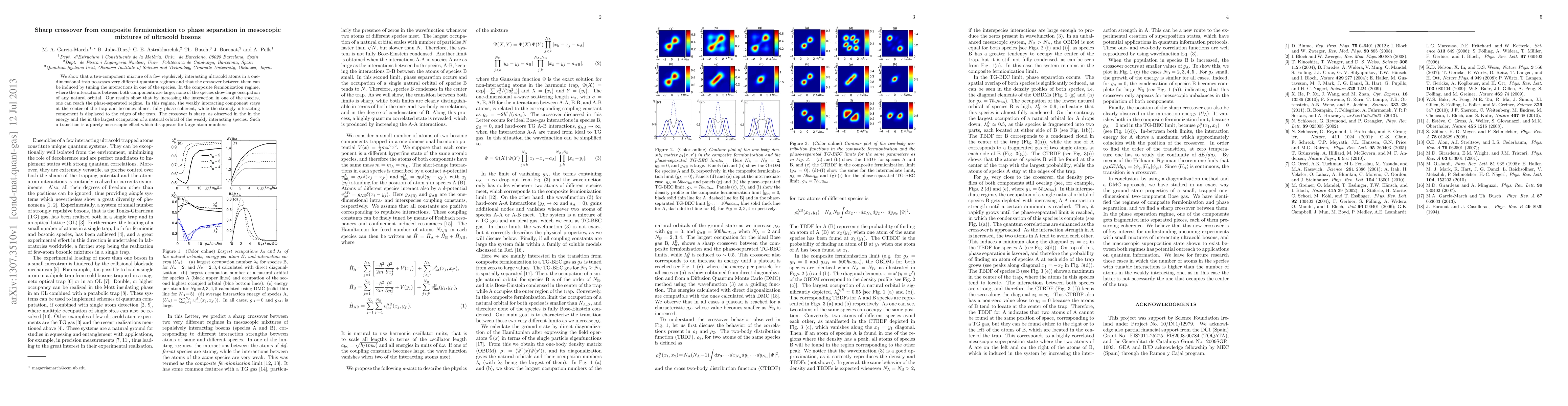 We show that a two-component mixture of a few repulsively interacting ultracold atoms in a one-dimensional trap possesses very different quantum regimes and that the crossover between them can be induced by tuning the interactions in one of the species. In the composite fermionization regime, where the interactions between both components are large, none of the species show large occupation of any natural orbital. Our results show that by increasing the interaction in one of the species, one can reach the phase-separated regime. In this regime, the weakly interacting component stays at the center of the trap and becomes almost fully phase coherent, while the strongly interacting component is displaced to the edges of the trap. The crossover is sharp, as observed in the in the energy and the in the largest occupation of a natural orbital of the weakly interacting species. Such a transition is a purely mesoscopic effect which disappears for large atom numbers.