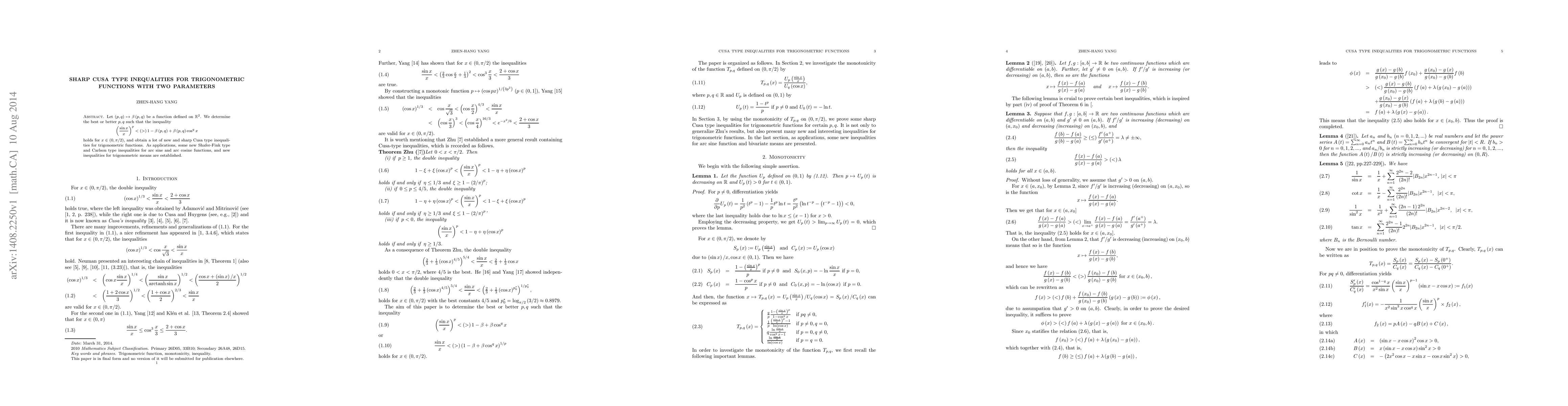 Let $\left( p,q\right) \mapsto \beta \left( p,q\right) $ be a function defined on $\mathbb{R}^{2}$. We determine the best or better $p,q$ such that the inequality% \begin{equation*} \left( \frac{\sin x}{x}\right) ^{p}<\left( >\right) 1-\beta \left( p,q\right) +\beta \left( p,q\right) \cos ^{q}x \end{equation*}% holds for $x\in \left( 0,\pi /2\right) $, and obtain a lot of new and sharp Cusa type inequalities for trigonometric functions. As applications, some new Shafer-Fink type and Carlson type inequalities for arc sine and arc cosine functions, and new inequalities for trigonometric means are established.