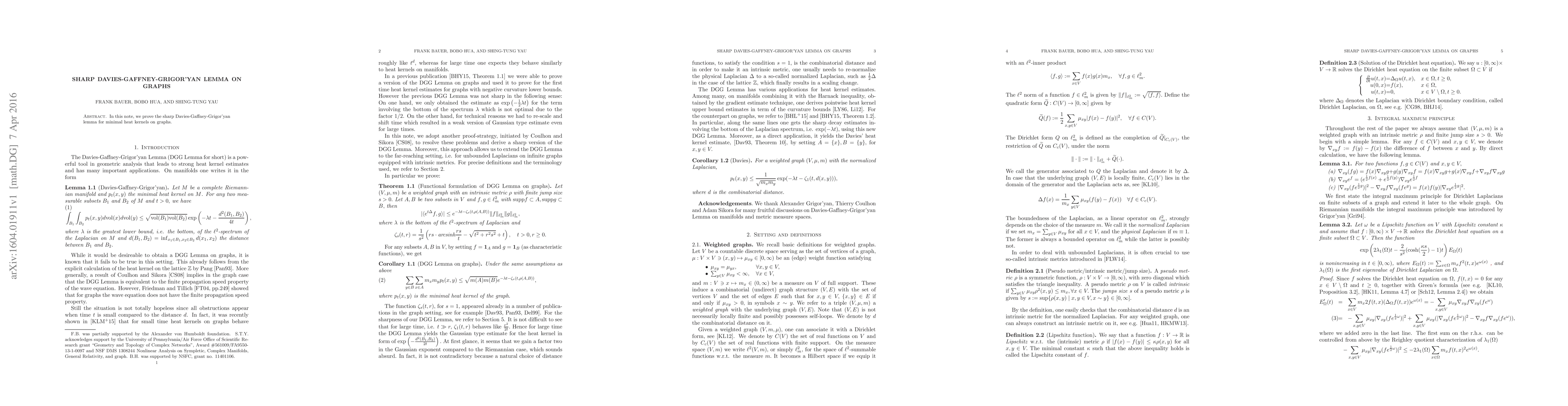 Summary: The paper establishes the most precise version of the Davies-Gaffney-Grigor'yan lemma for minimal heat kernels on graphs, providing a tighter bound in this context.