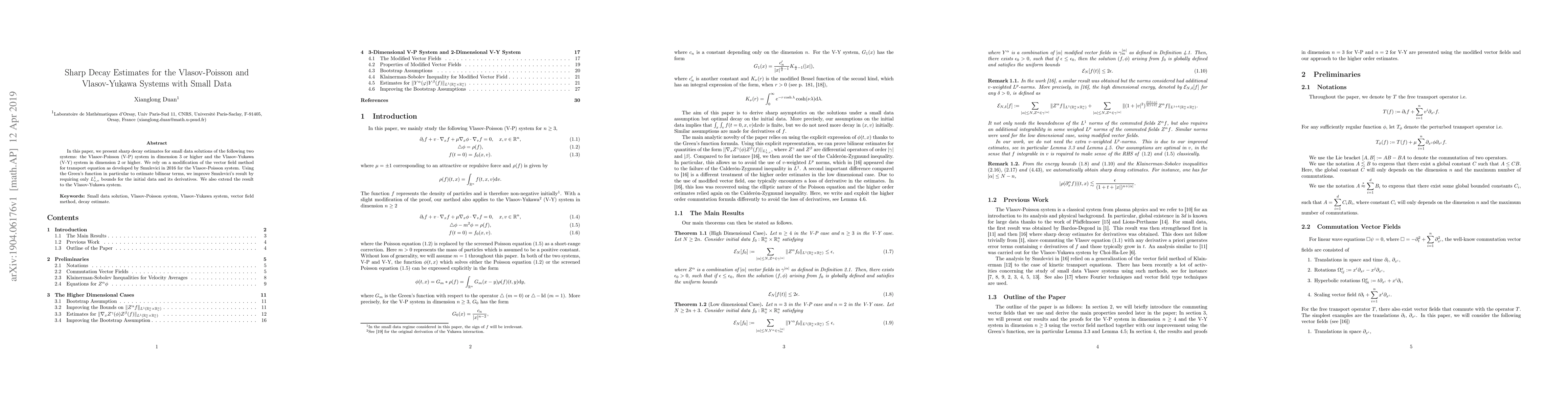 In this paper, we present sharp decay estimates for small data solutions of the following two systems: the Vlasov-Poisson (V-P) system in dimension 3 or higher and the Vlasov-Yukawa (V-Y) system in dimension 2 or higher. We rely on a modification of the vector field method for transport equation as developed by Smulevici in 2016 for the Vlasov-Poisson system. Using the Green's function in particular to estimate bilinear terms, we improve Smulevici's result by requiring only $L^1_{x,v}$ bounds for the initial data and its derivatives. We also extend the result to the Vlasov-Yukawa system.