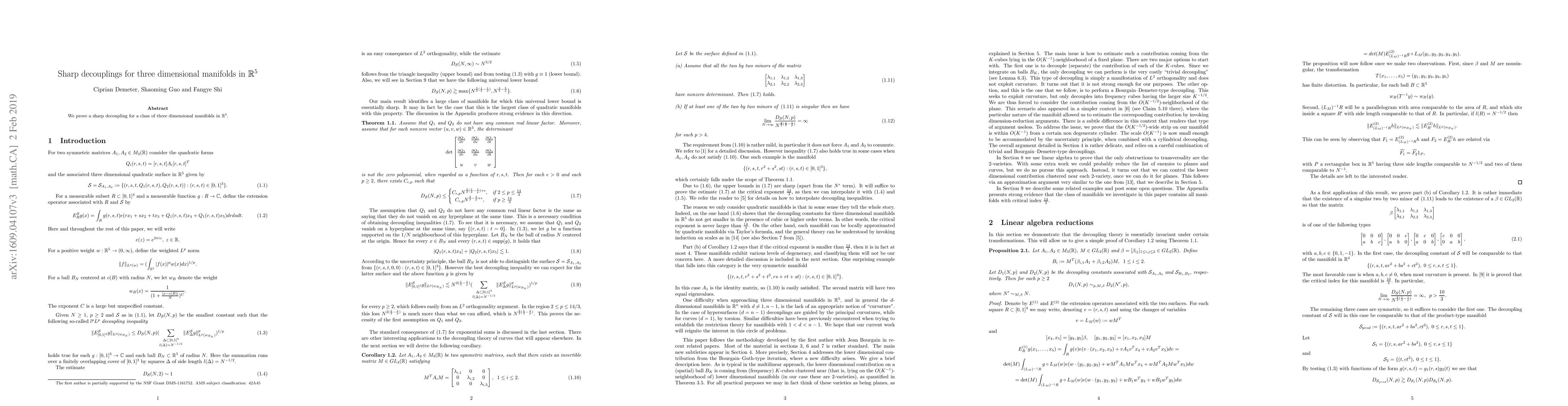 Summary: This paper establishes a sharp decoupling inequality for a specific class of three-dimensional manifolds embedded in five-dimensional Euclidean space, providing significant insights into the geometric and analytic properties of these manifolds. The result is optimal and contributes to the understanding of decoupling phenomena in higher-dimensional settings.