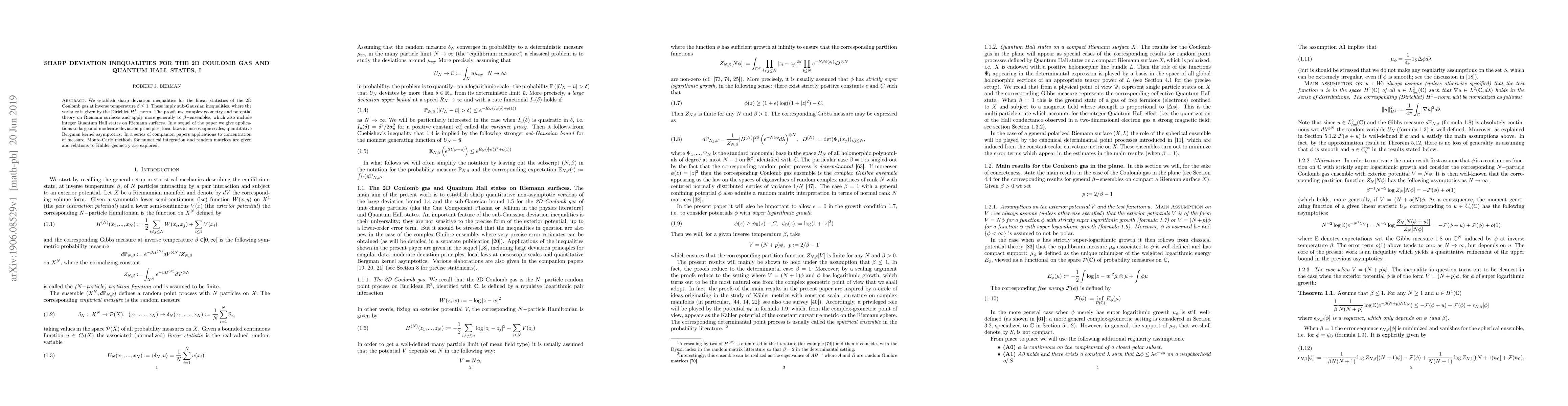 We establish sharp deviation inequalities for the linear statistics of the 2D Coulomb gas. These imply sub-Gaussian inequalities, where the variance is given by the Dirichlet norm. The proofs use complex geometry and potential theory on Riemann surfaces and apply more generally to beta-ensembles, which also include integer Quantum Hall states on Riemann surfaces. In a sequel of the paper we give applications to large and moderate deviation principles, local laws at mesoscopic scales, quantitative Bergman kernel asymptotics. In a series of companion papers applications to concentration of measure, Monte-Carlo methods for numerical integration and random matrices are given and relations to Kahler geometry are explored.