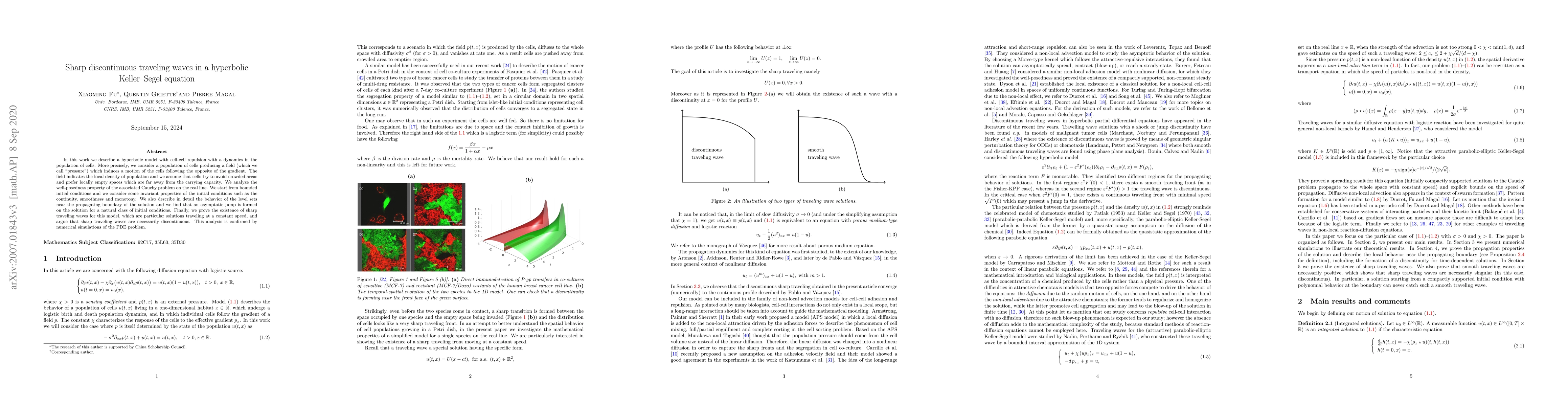 The paper introduces a hyperbolic model of cell movement with repulsion, showing that sharp traveling waves form on the solution under certain initial conditions, leading to discontinuous solutions that avoid crowded areas.