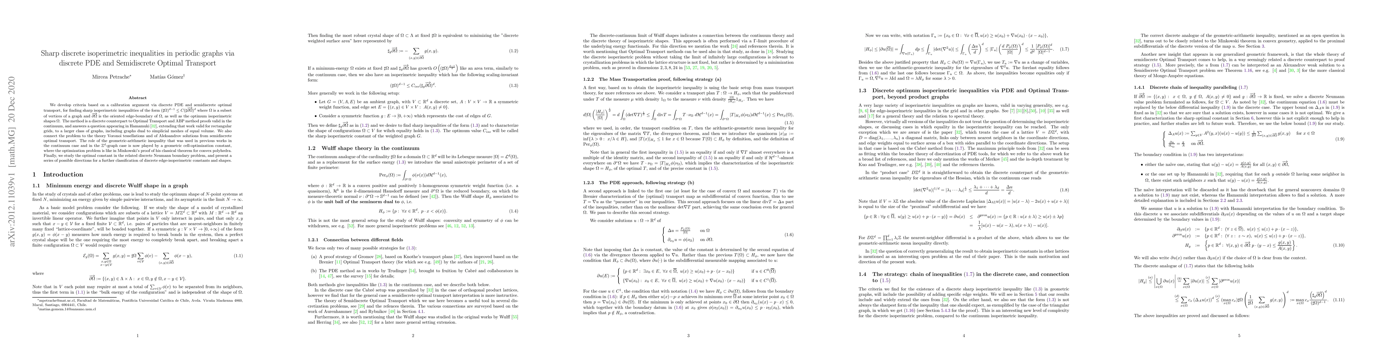 This paper develops criteria using discrete PDE and semidiscrete optimal transport to derive sharp discrete isoperimetric inequalities in periodic graphs, extending previous results to a broader class of graphs. It also explores the optimal shapes and connections to Voronoi tessellations and Aleksandrov solutions, proposing future directions for classifying discrete edge-isoperimetric constants.