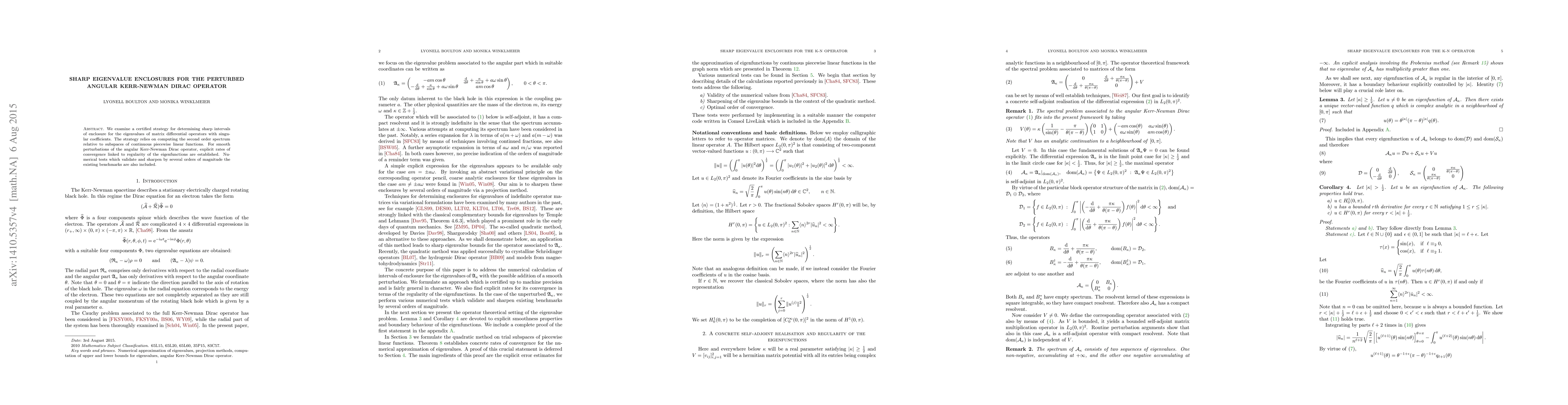 A certified strategy for determining sharp intervals of enclosure for the eigenvalues of matrix differential operators with singular coefficients is examined. The strategy relies on computing the second order spectrum relative to subspaces of continuous piecewise linear functions. For smooth perturbations of the angular Kerr-Newman Dirac operator, explicit rates of convergence due to regularity of the eigenfunctions are established. Existing benchmarks are validated and sharpened by several orders of magnitude in the unperturbed setting.